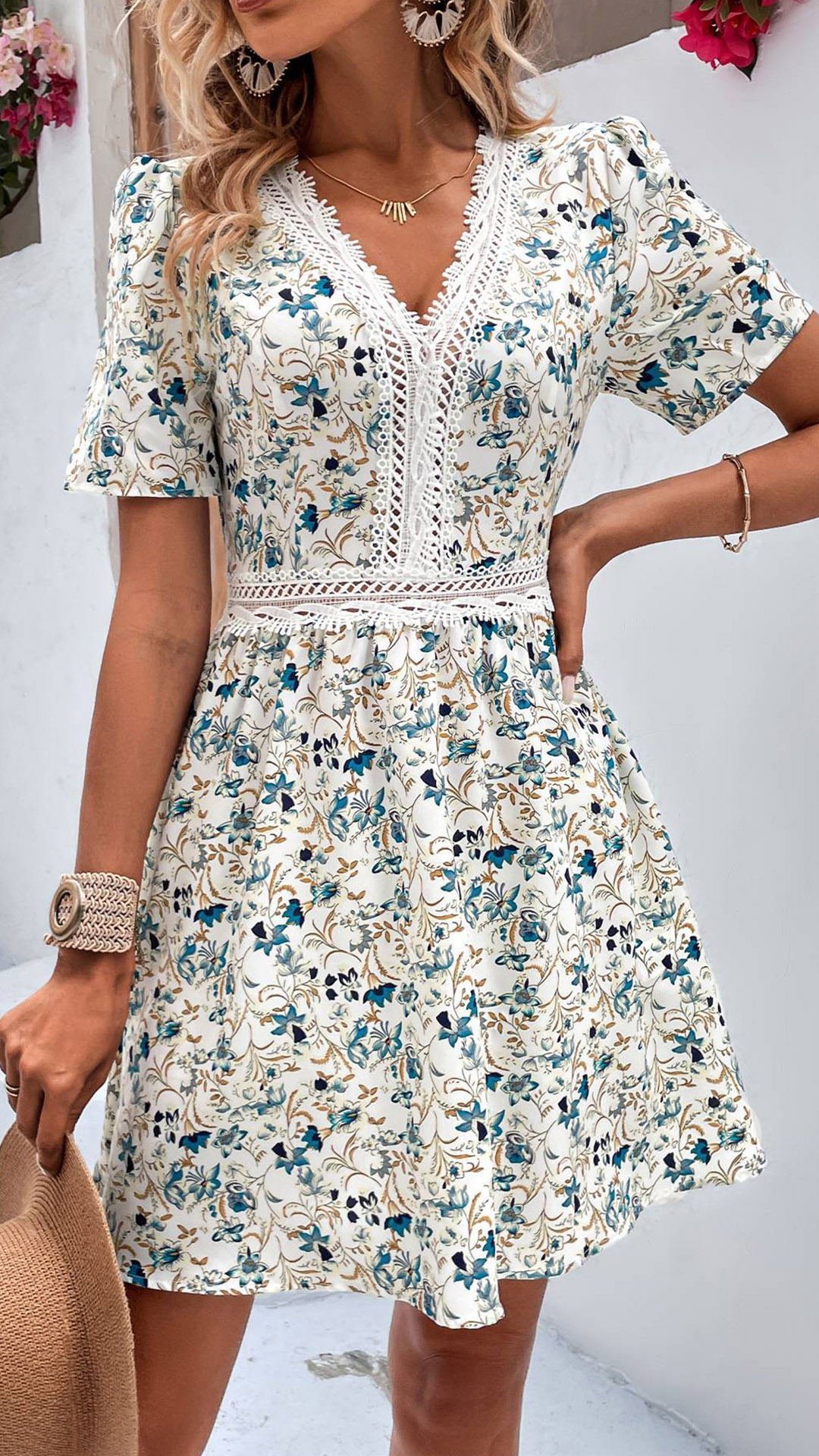 This dress is a perfect blend of femininity and fashion. With its floral print, lace spliced details, V-neckline, and short sleeves, it exudes a sense of elegance and style.