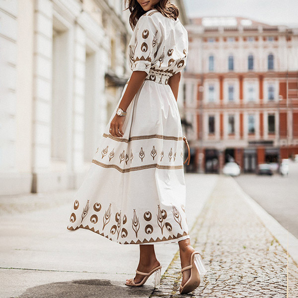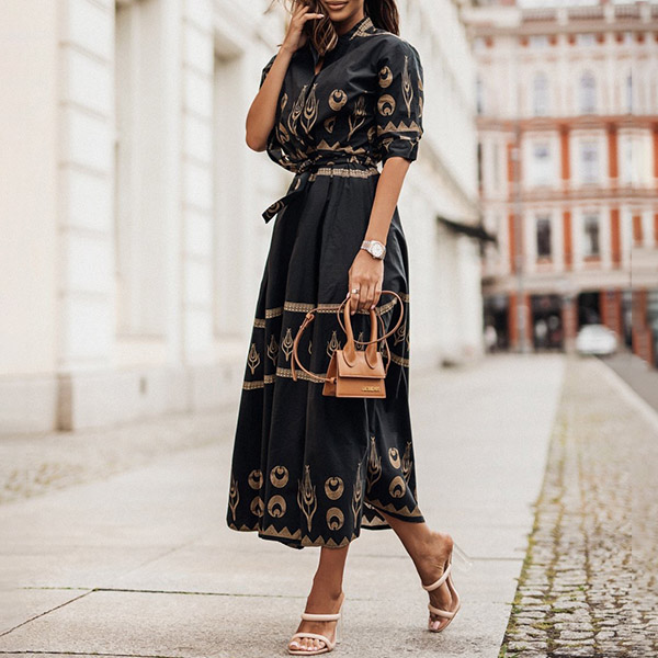 Fashion Floral Printed Mock Neck Elbow Sleeve Self-tie Dress