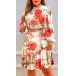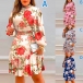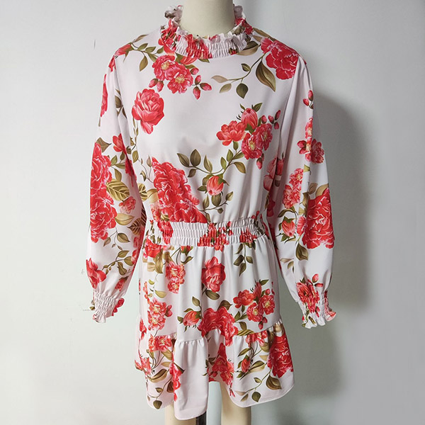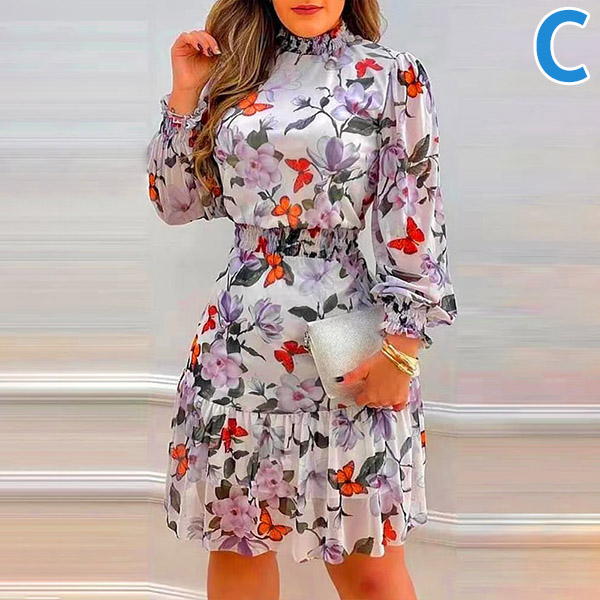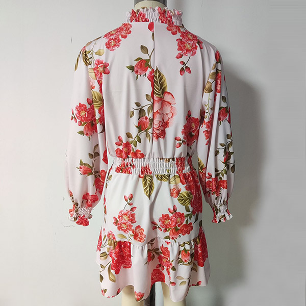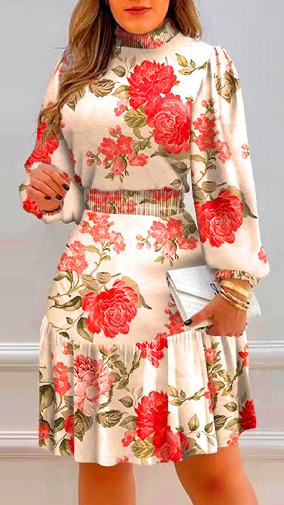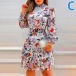 Fashion Floral Printed Mock Neck Long Sleeve Cinch Waist Mini Dress