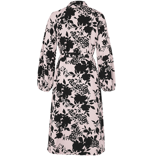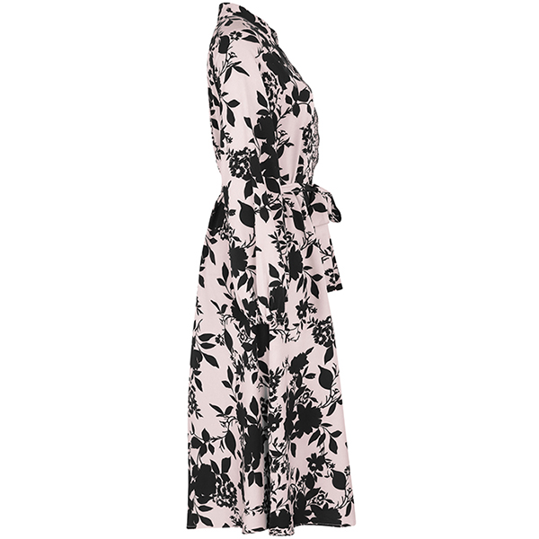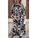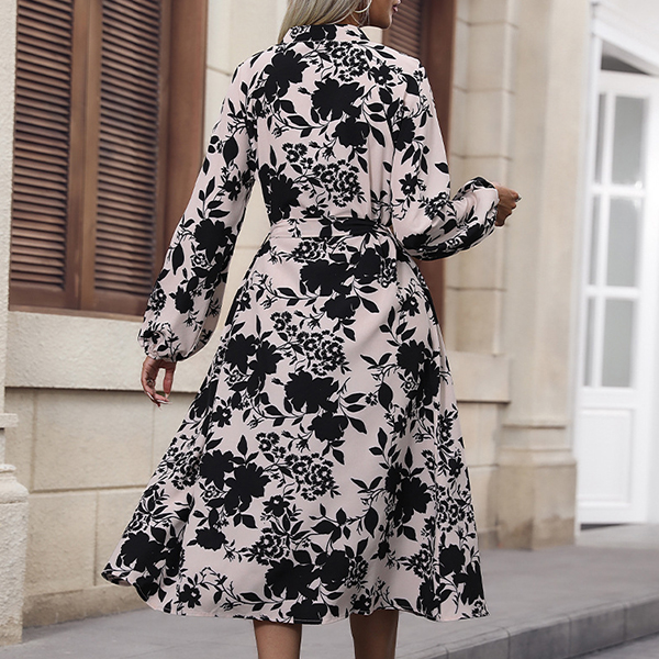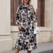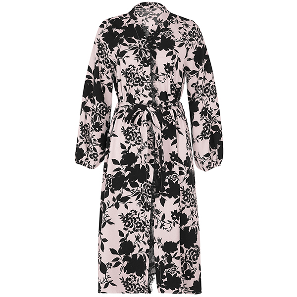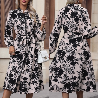 Fashion Floral Printed Mock Neck Long Sleeve Front Slit Self-tie Dress