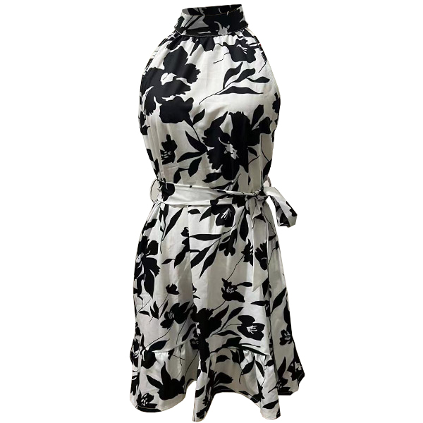 This mini dress features a floral print, mock neck, sleeveless design, and a self-tie waist for a fashionable and versatile look.