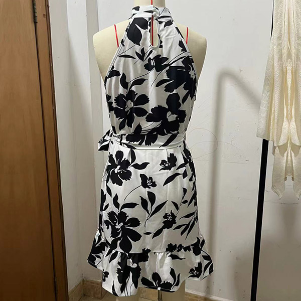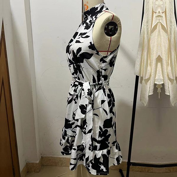 Fashion Floral Printed Mock Neck Sleeveless Self-tie Mini Dress