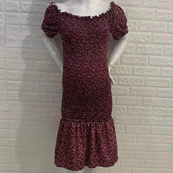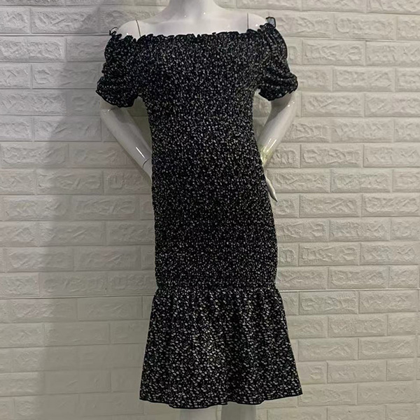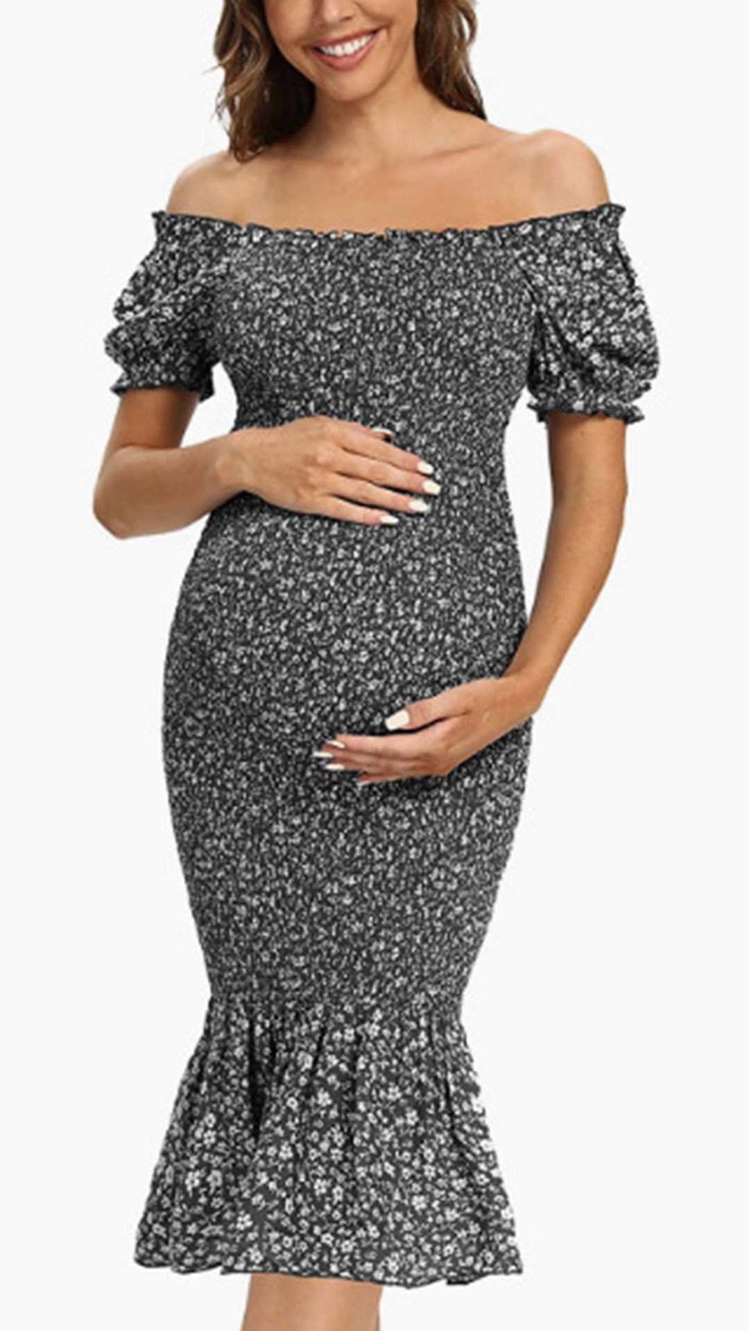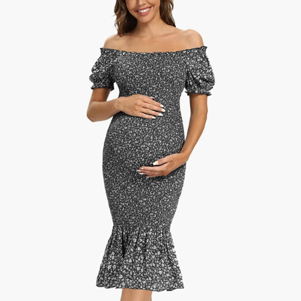 This beautiful maternity dress features a trendy off-the-shoulder design and short sleeves for a fashionable look. Made with high-quality materials, this dress is comfortable to wear and will make you feel beautiful and confident throughout your pregnancy.