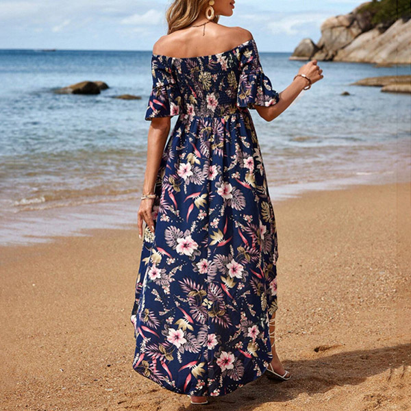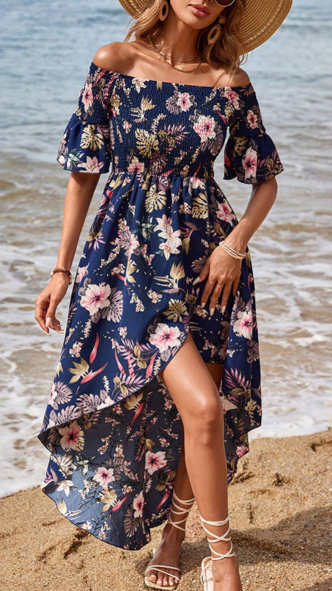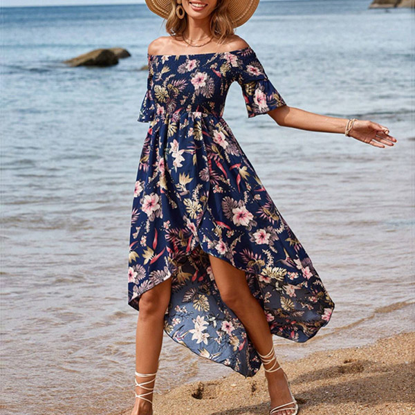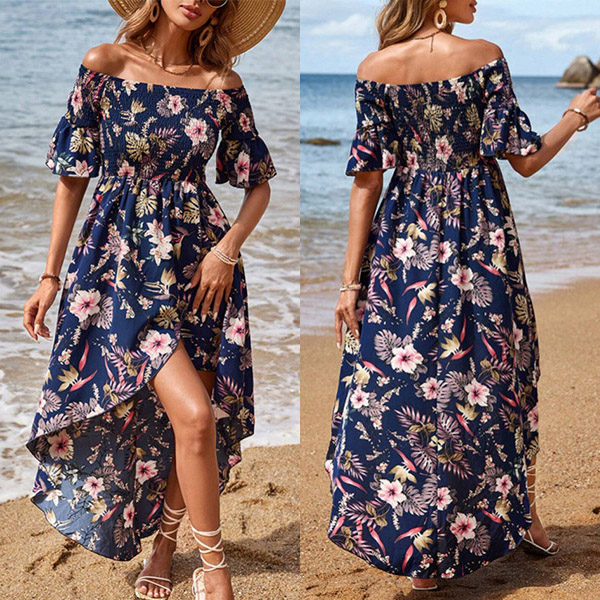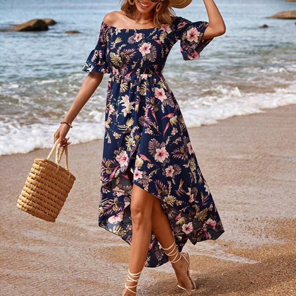This is a stylish and feminine summer dress that combines an off-the-shoulder neckline, short sleeves, floral print, and an irregular hemline for a trendy and fashionable look.