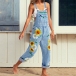 Fashion Floral Printed Old-washed Denim Suspender Jumpsuit