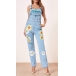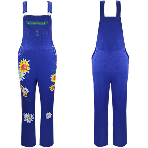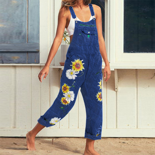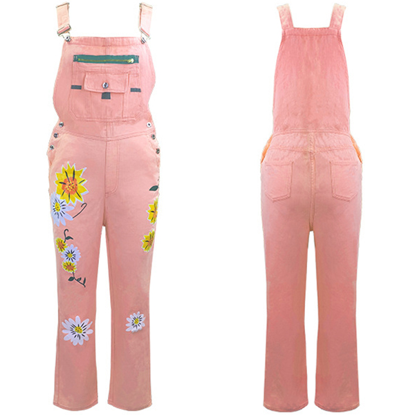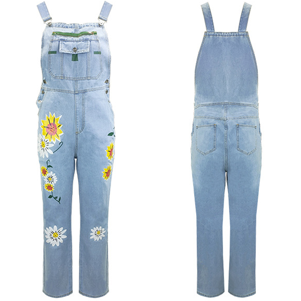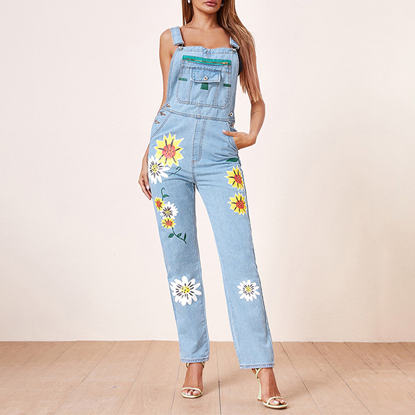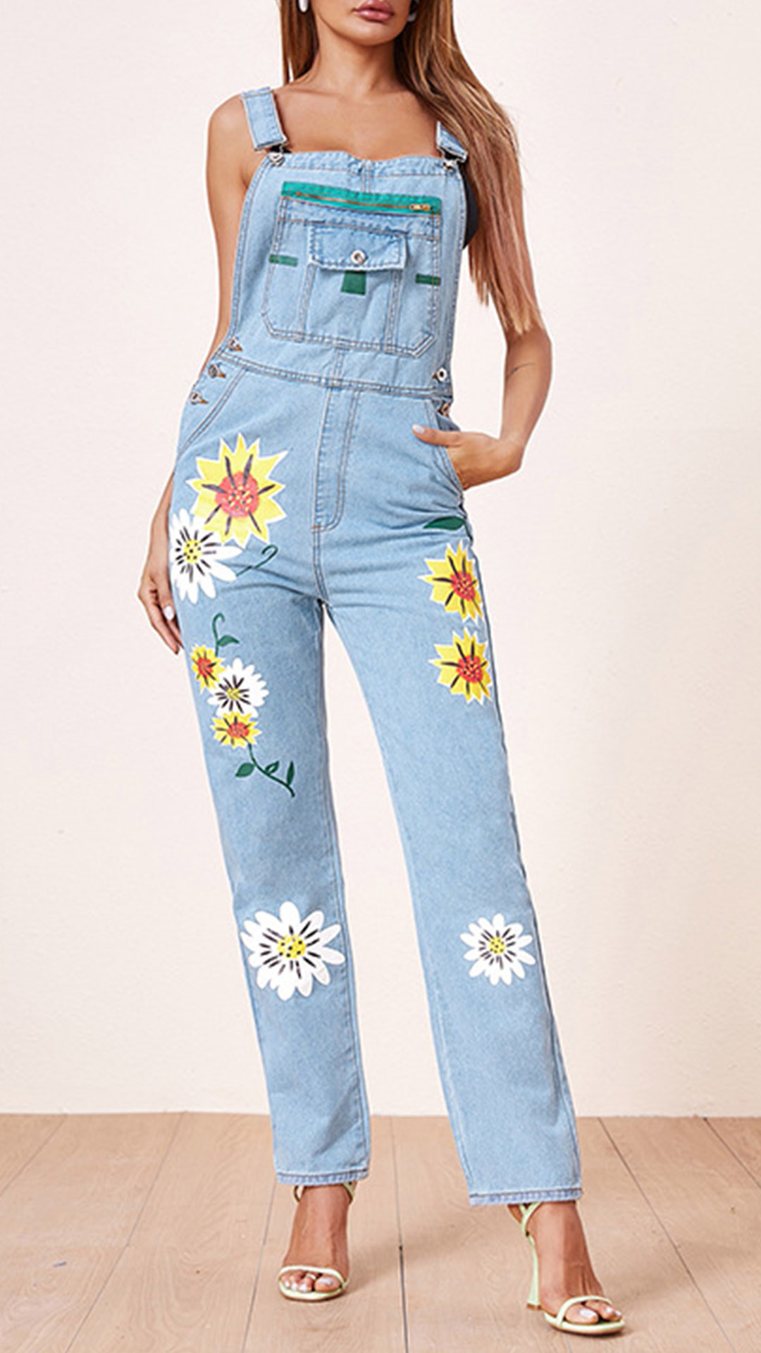 This jumpsuit features a floral print, old-washed denim fabric, and suspender-style straps, creating a stylish and on-trend look.