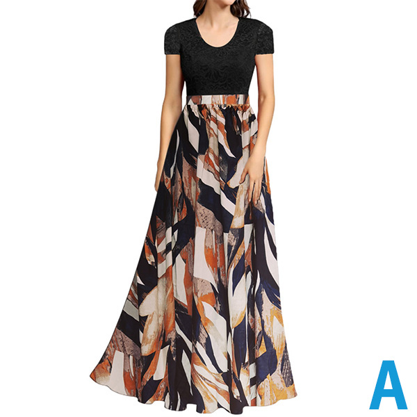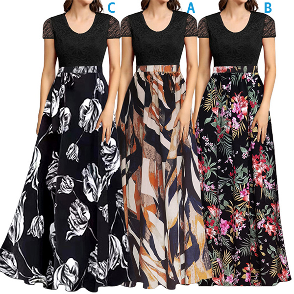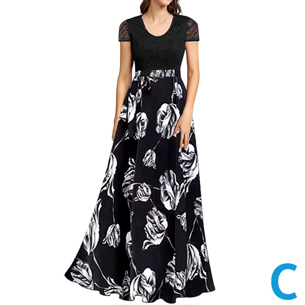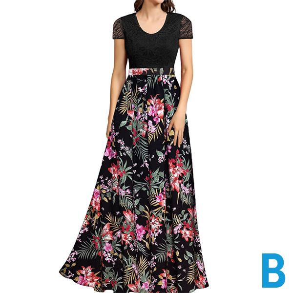 Fashion Floral Printed Round Neck Lace Spliced Bodice Maxi Dress