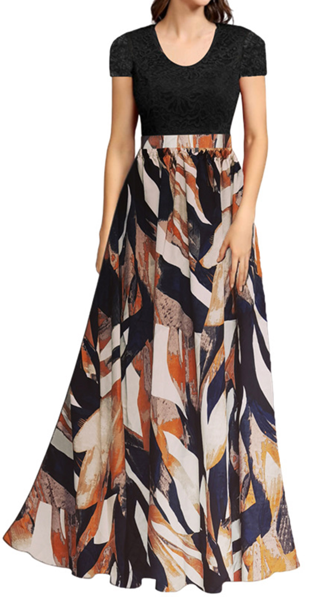 This maxi dress features a round neckline, offering a classic and flattering style that suits various body types. The lace bodice looks chic and stylish, while the floral printed skirt add some bohe element to this dress, wanna have a try?