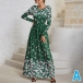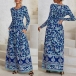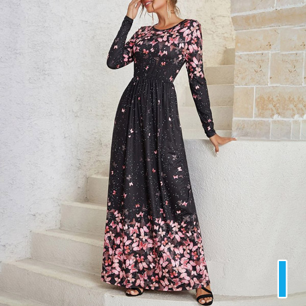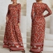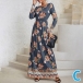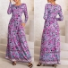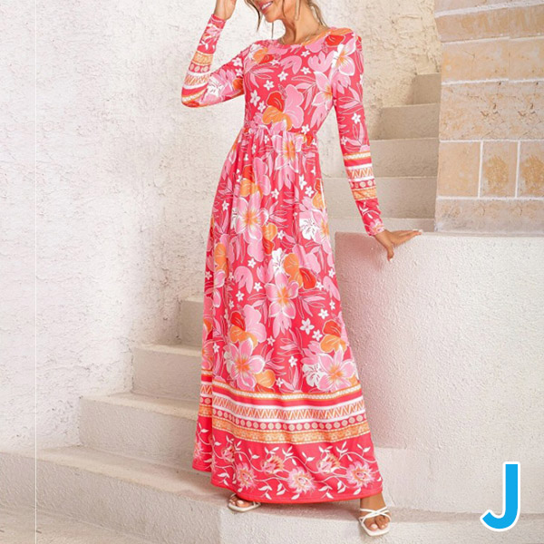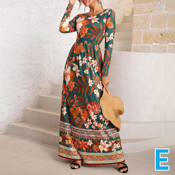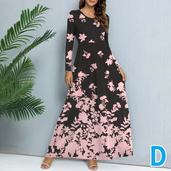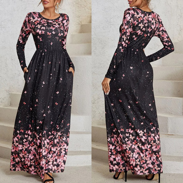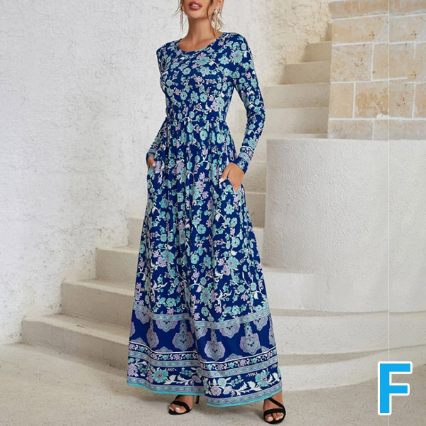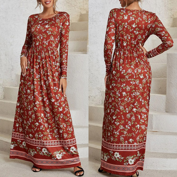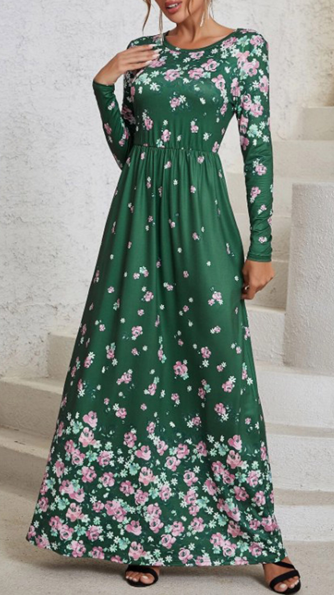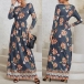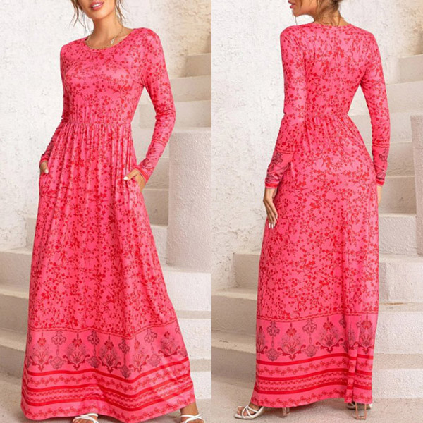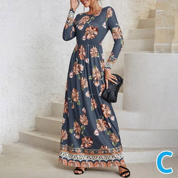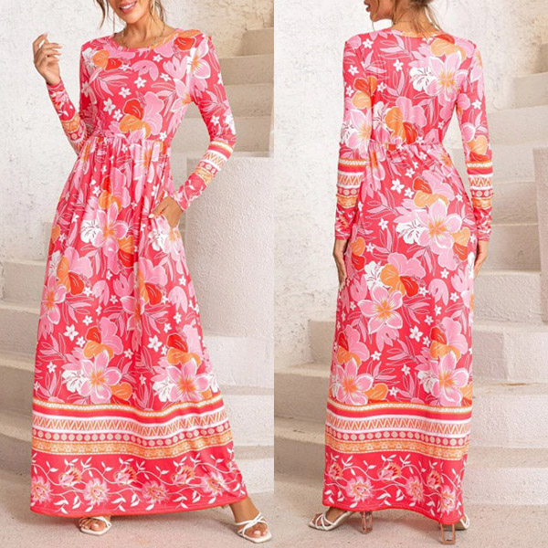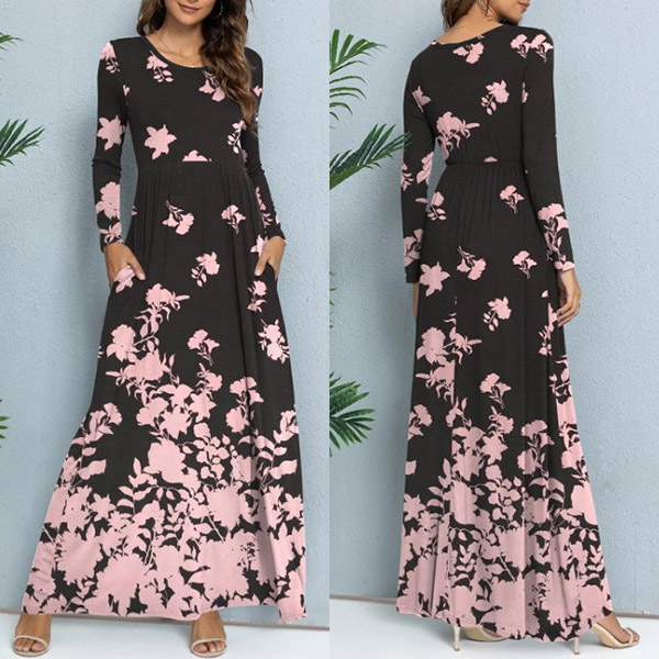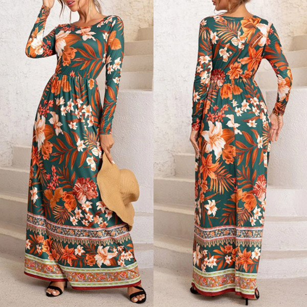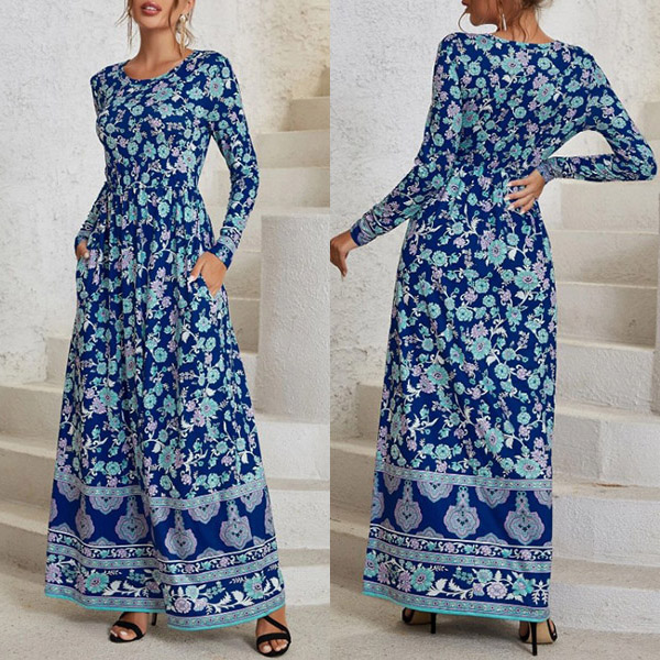 Fashion Floral Printed Round Neck Long Sleeve Maxi Dress