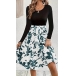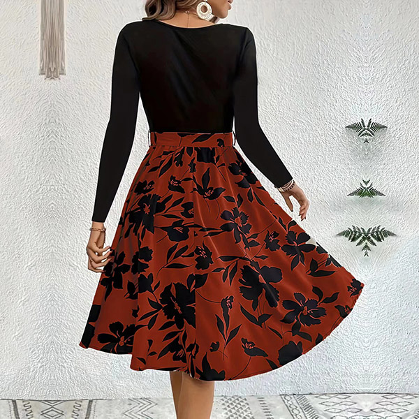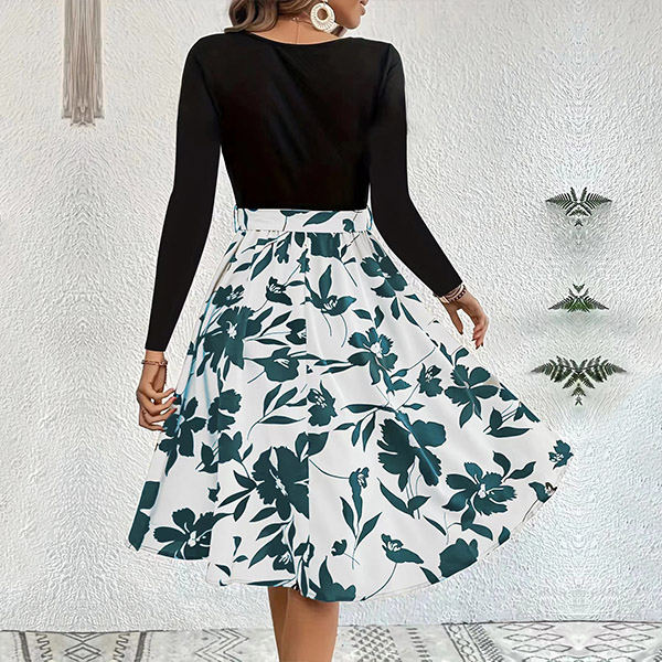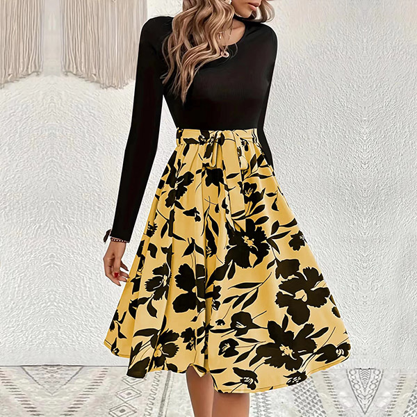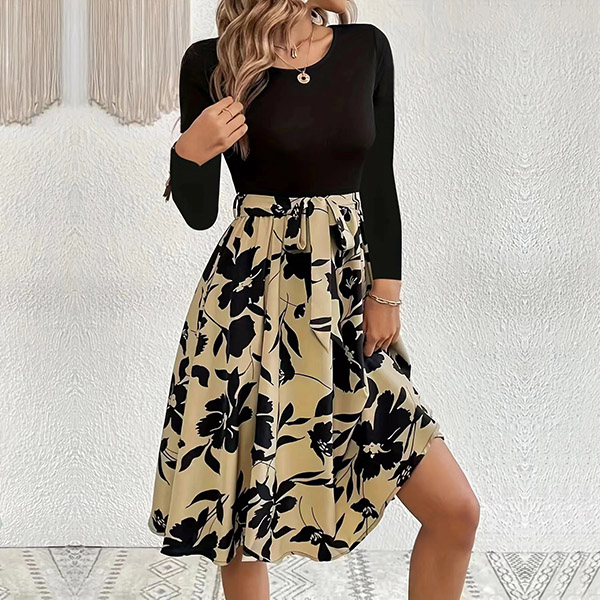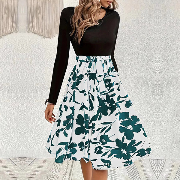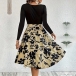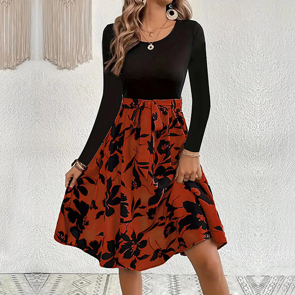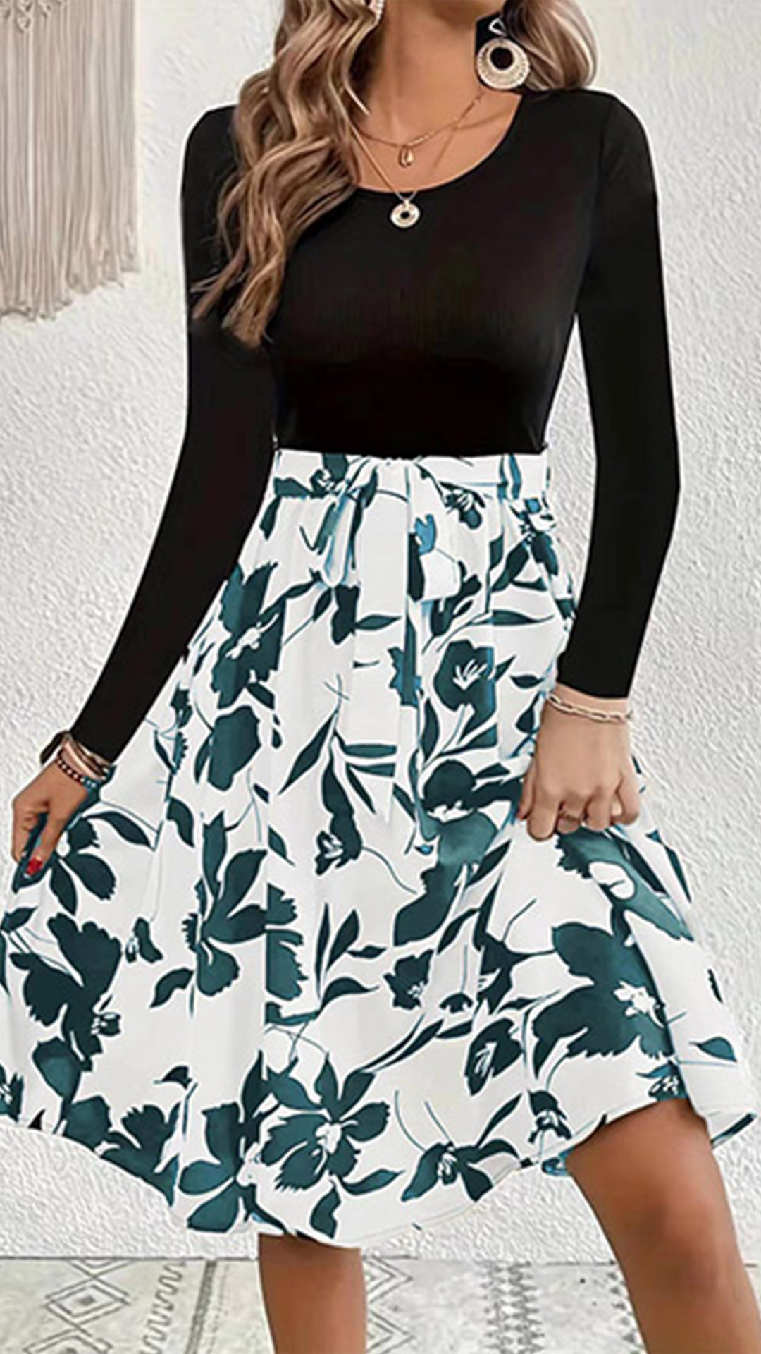 Fashion Floral Printed Round Neck Long Sleeve Mini Dress