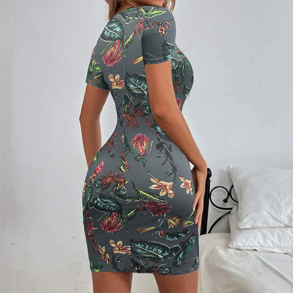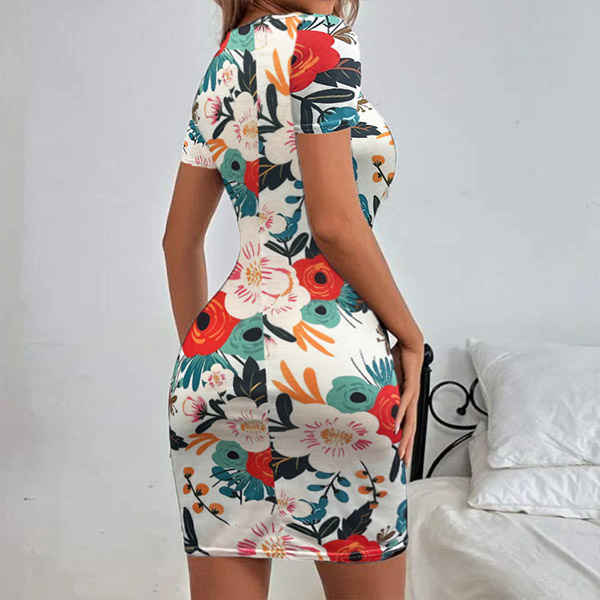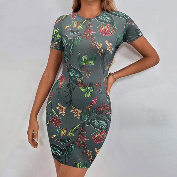 Fashion Floral Printed Round Neck Short Sleeve Bodycon Dress