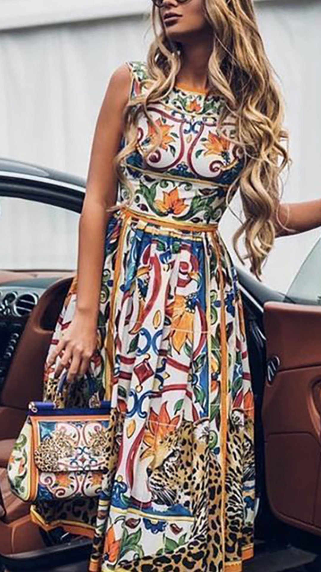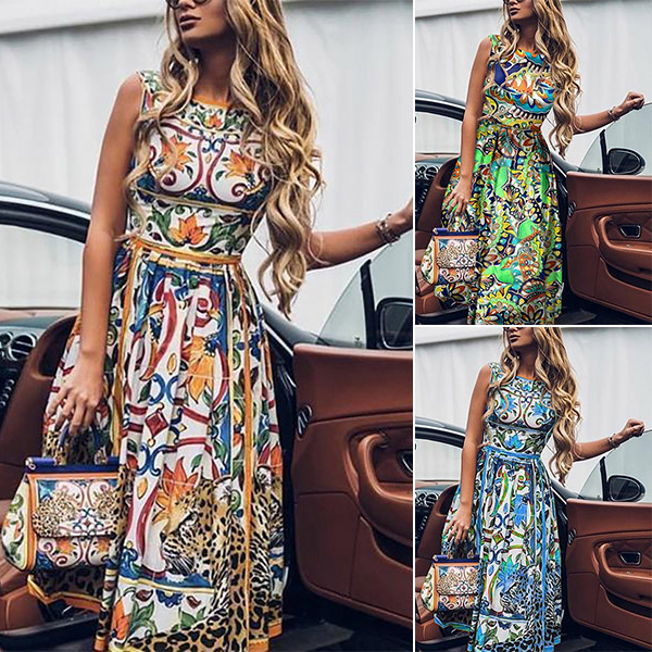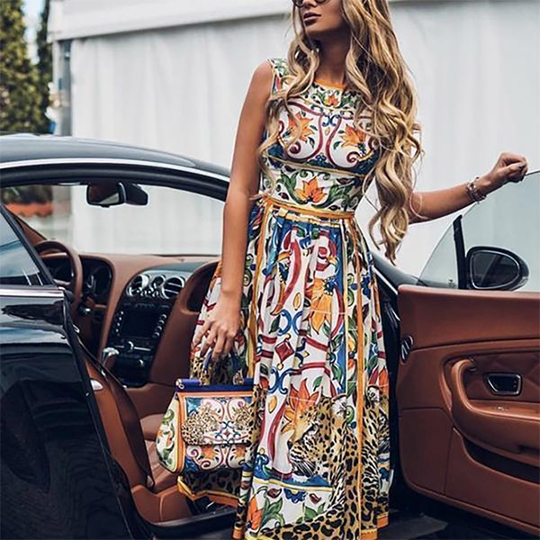 Fashion Floral Printed Round Neck Sleeveless Dress