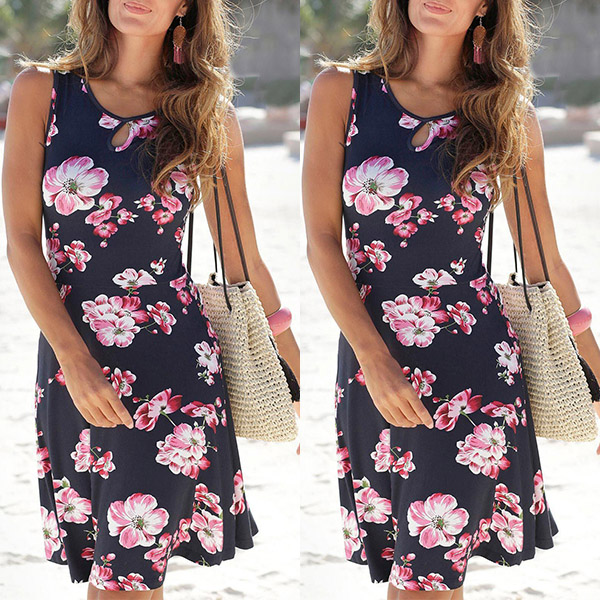 Fashion Floral Printed Round Neck Sleeveless Dress