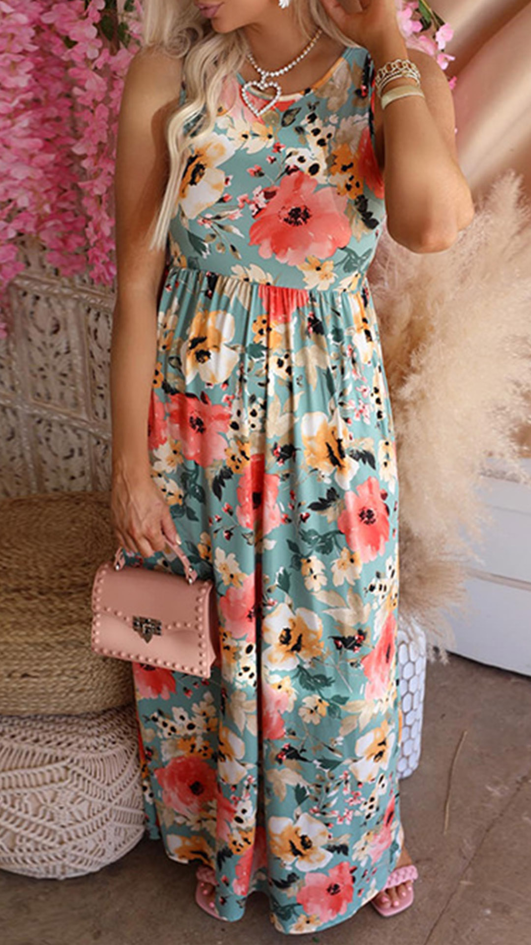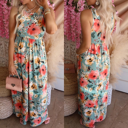 Fashion Floral Printed Round Neck Sleeveless Maxi Dress