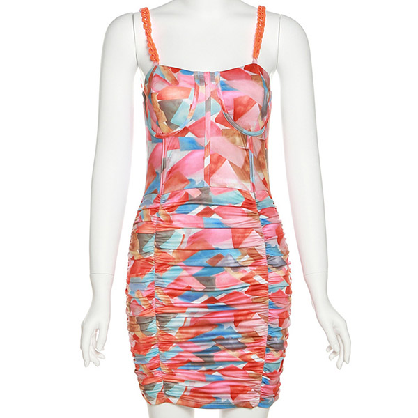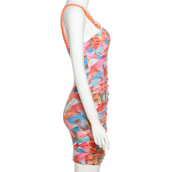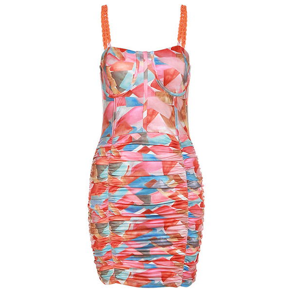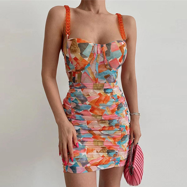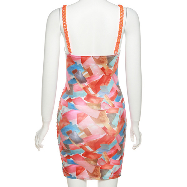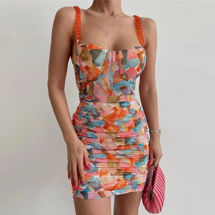 Fashion Floral Printed Ruched Chain Slip Bodycon Dress