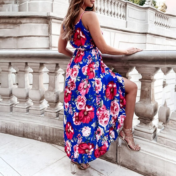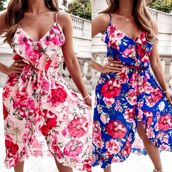 This pretty slip dress is perfect for a summer day! The fashion floral print is pretty and feminine, and the ruffled details along the V-neck and slit hemline add a touch of fun. Is it your style?