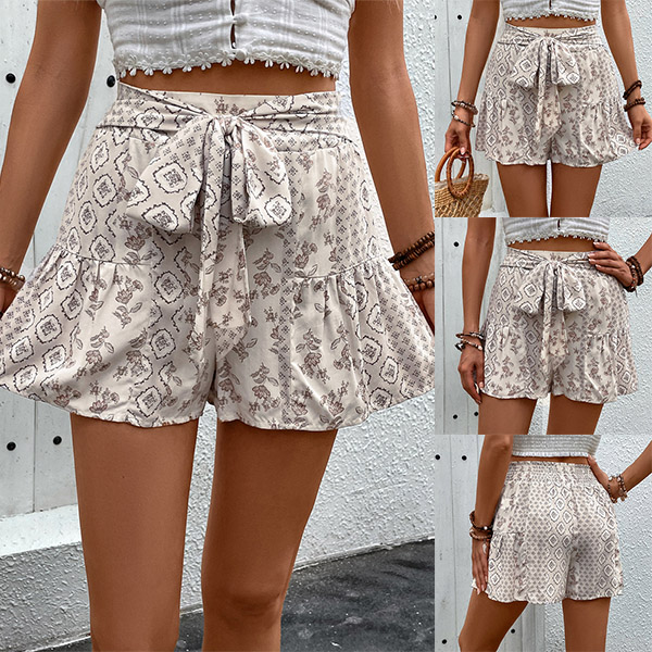 These stylish women's shorts feature a vibrant, feminine floral print with a front self-tie bowknot design, that exudes a fresh, fashion-forward appeal.