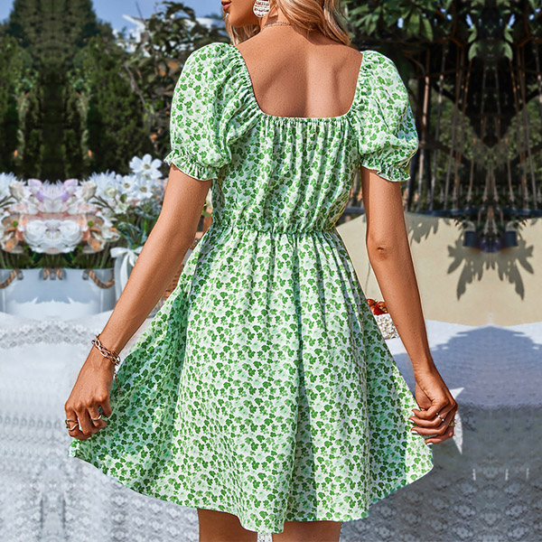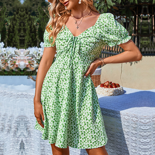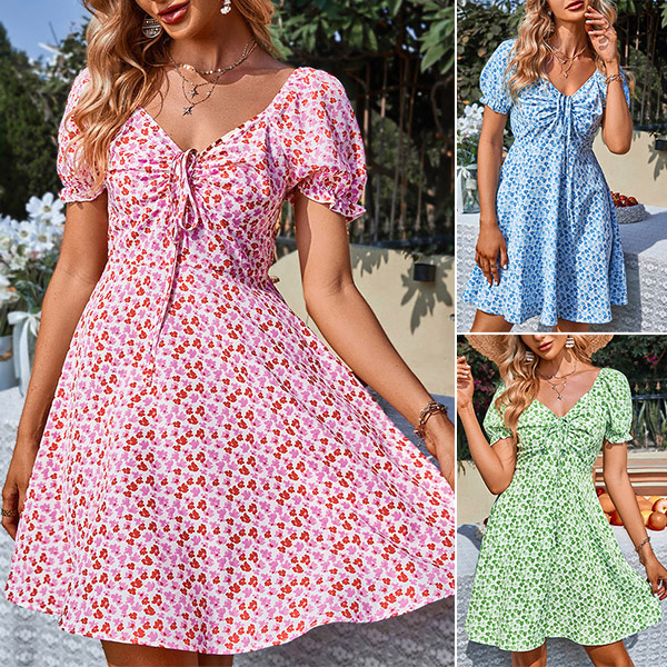 Fashion Floral Printed Self-tie V-neck Short Sleeve Fit & Flare Dress