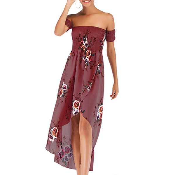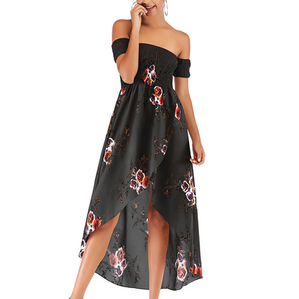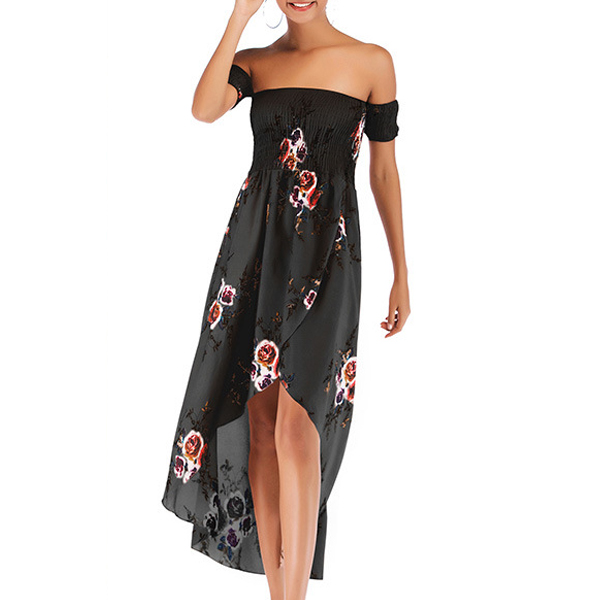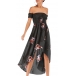 Fashion Floral Printed Smocked Strapless Irregular Hemline Dress