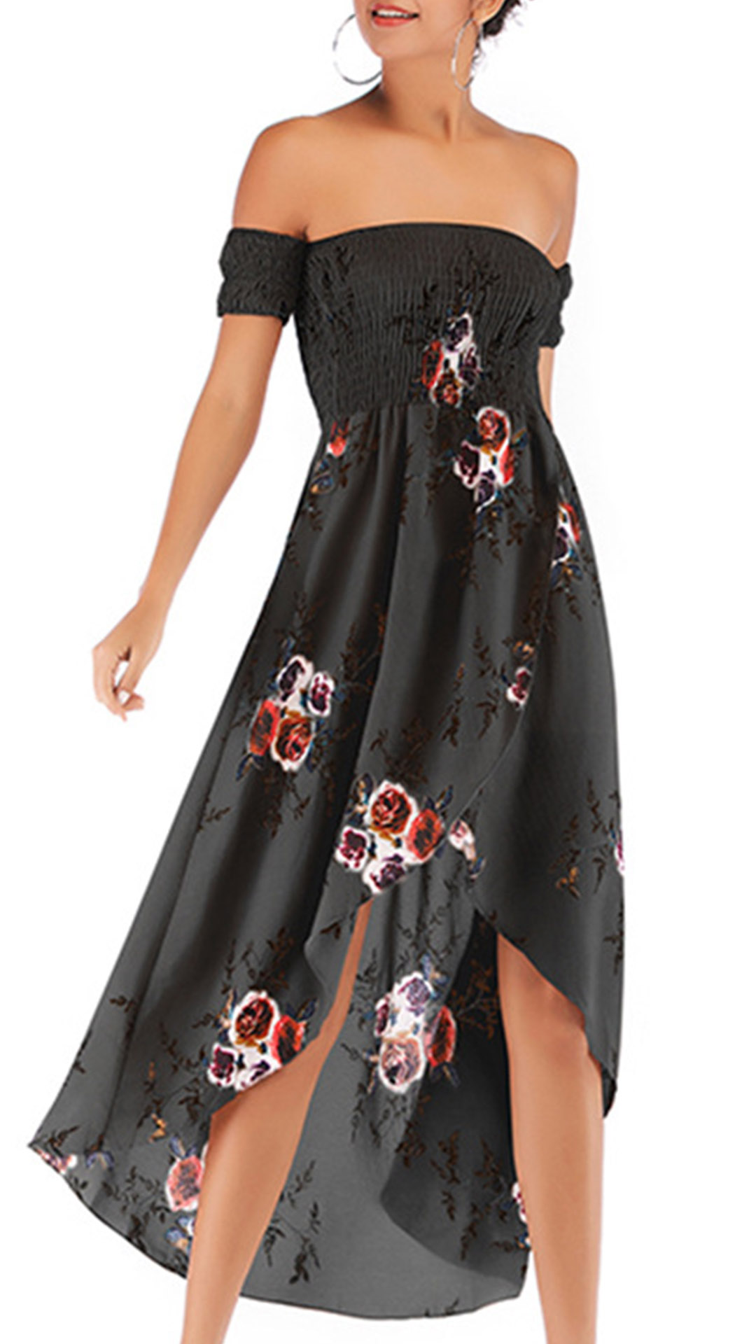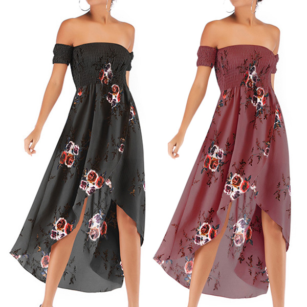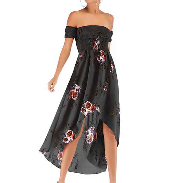 How about this dress? It features a stunning floral print design with a smocked bodice that provides a comfortable and secure fit without compromising on style. The strapless neckline and irregular hemline add a touch of elegance and uniqueness to the overall design. Color:Wine Red,Black, which one do you like?