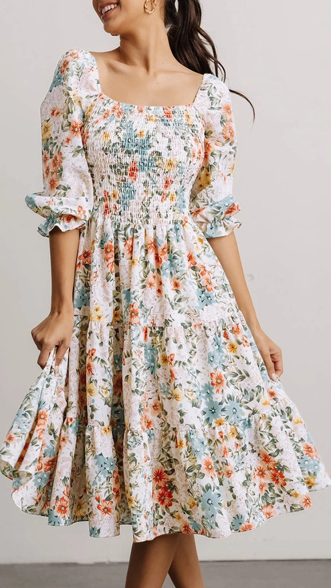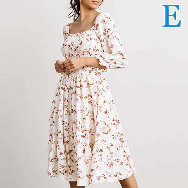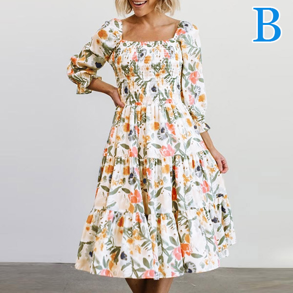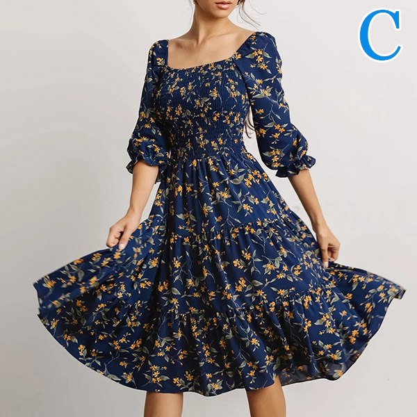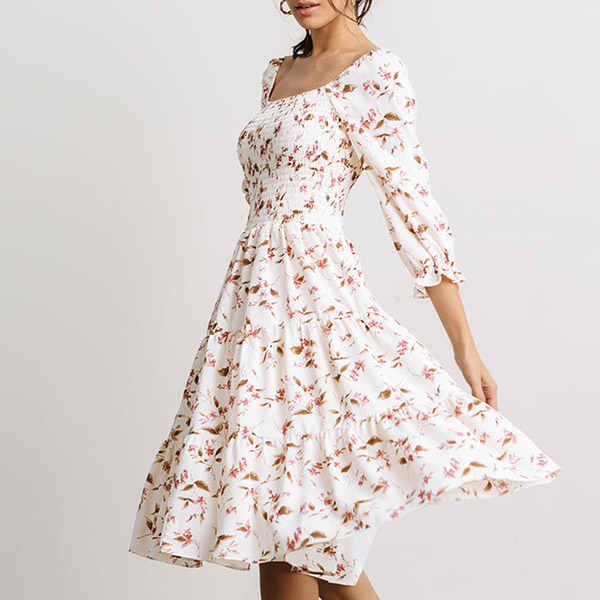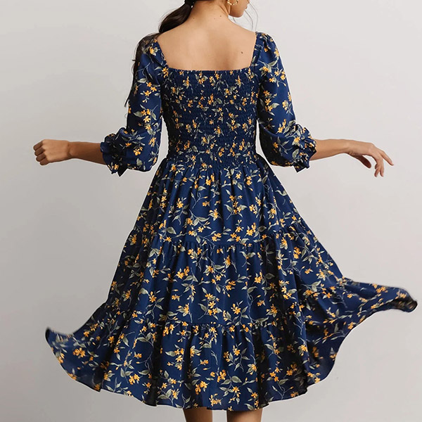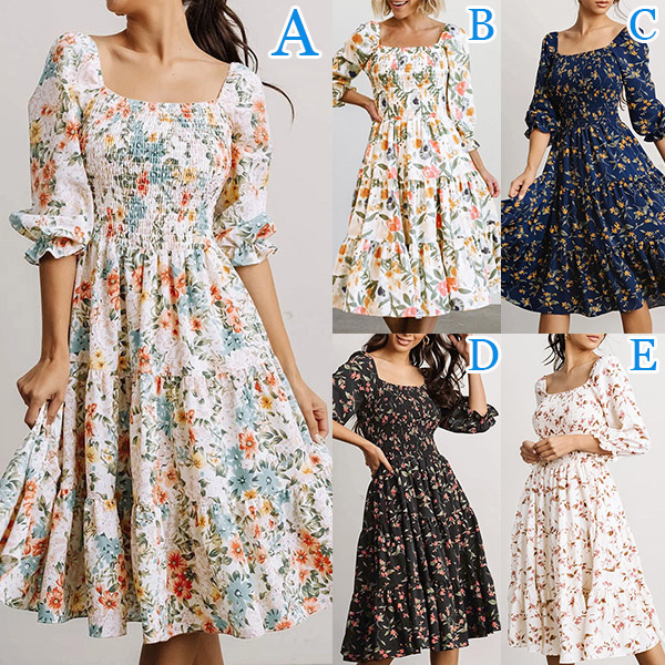 How about this dress? The bold floral print is eye-catching and unique, while the square neckline and elbow-length sleeves give it a classic feel. The lightweight fabric is comfortable and breathable, so you can wear it all day without feeling stuffy. Whether you're headed to a summer garden party or a romantic dinner date, this dress is sure to turn heads.