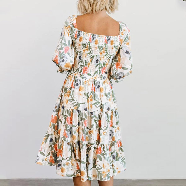 Fashion Floral Printed Square Neck Elbow Sleeve Dress