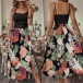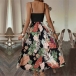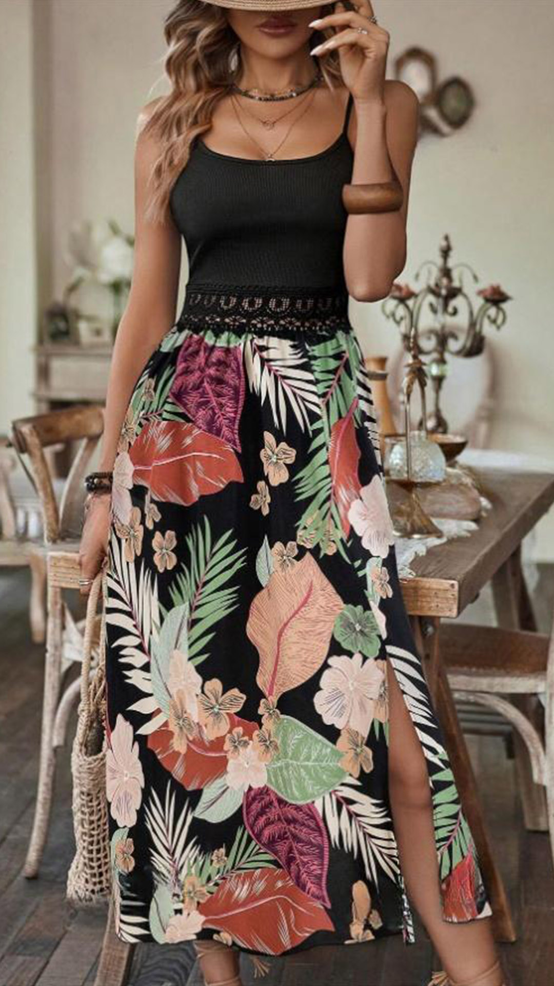 Fashion Floral Printed Square Neck Lace Spliced Waist Side Slit Slip Dress