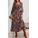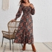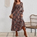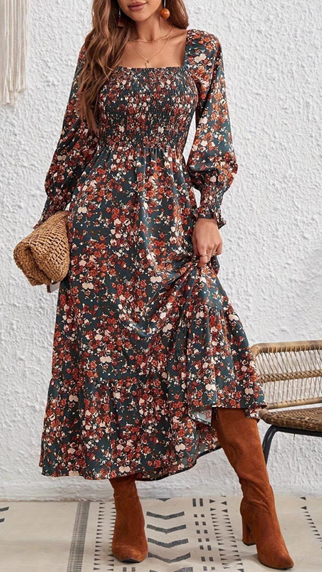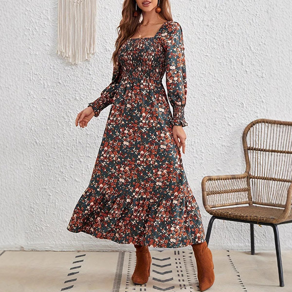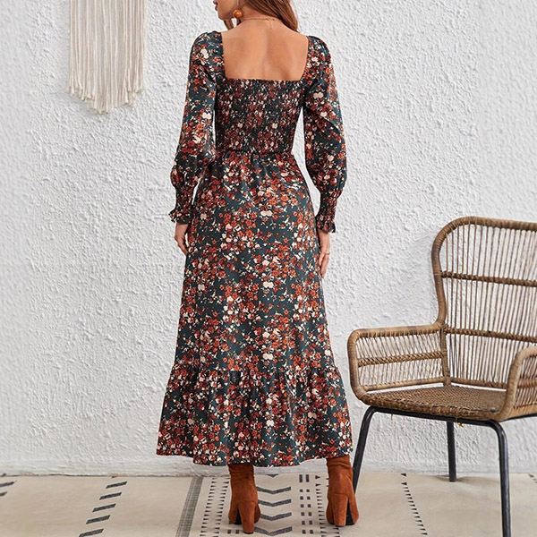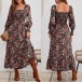 Fashion Floral Printed Square Neck Long Sleeve Midi Dress