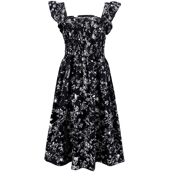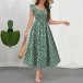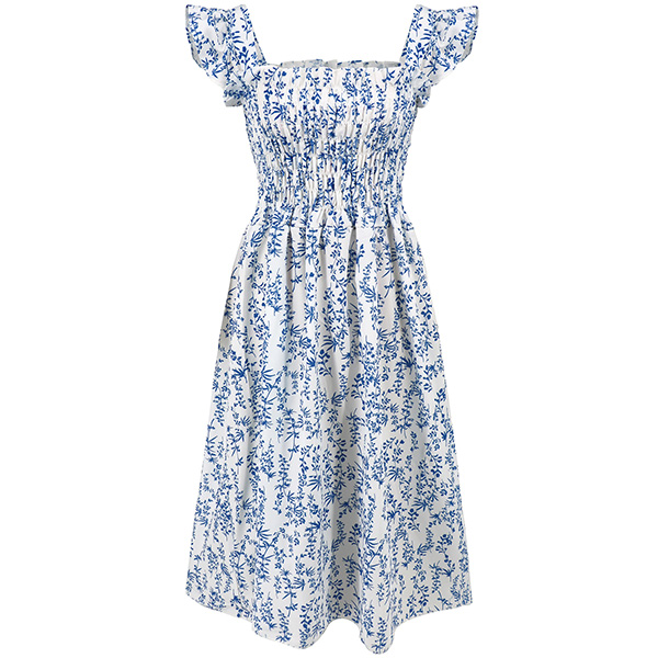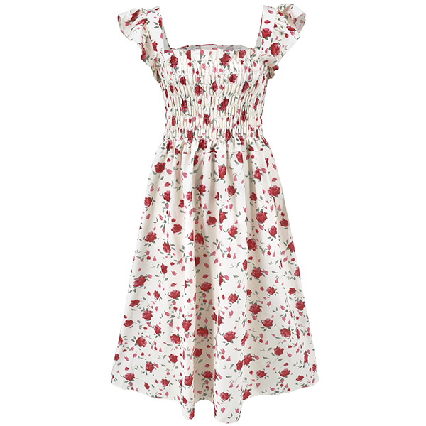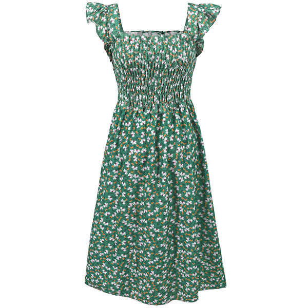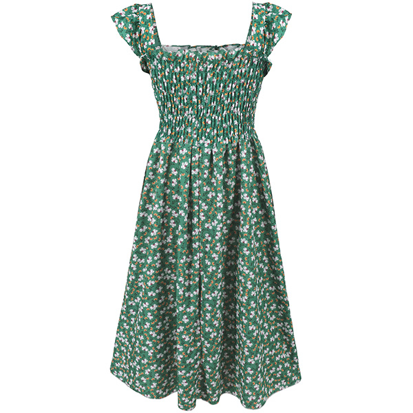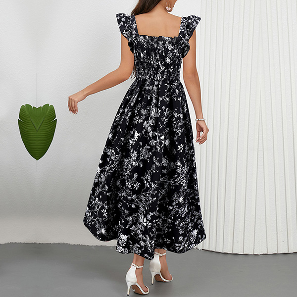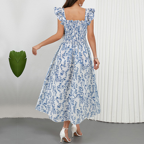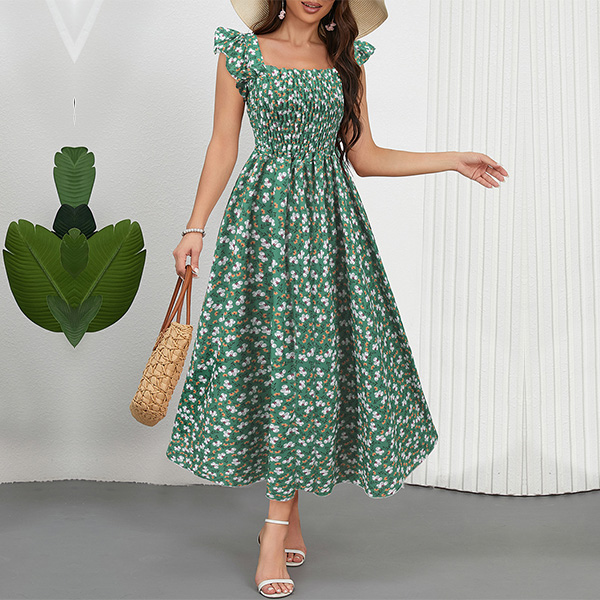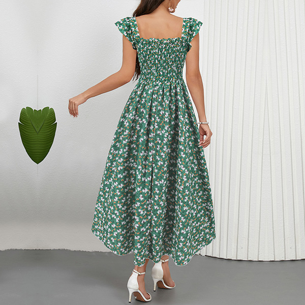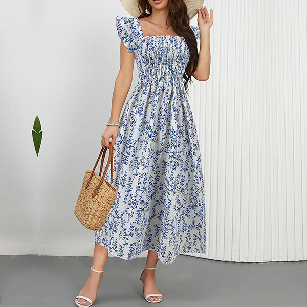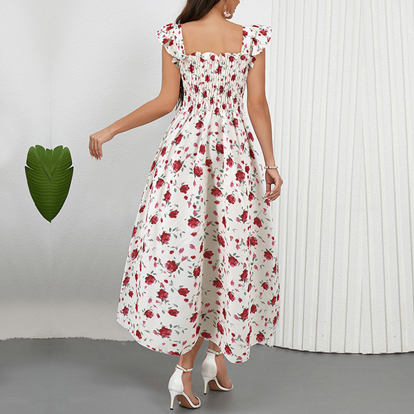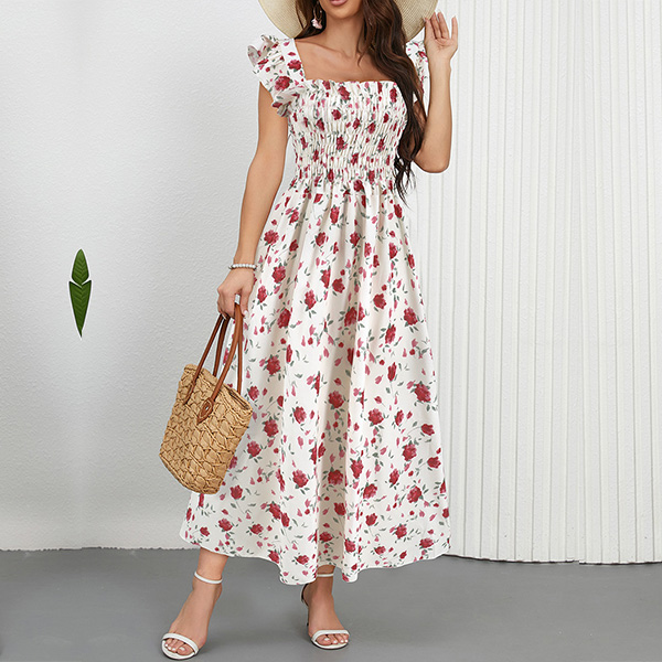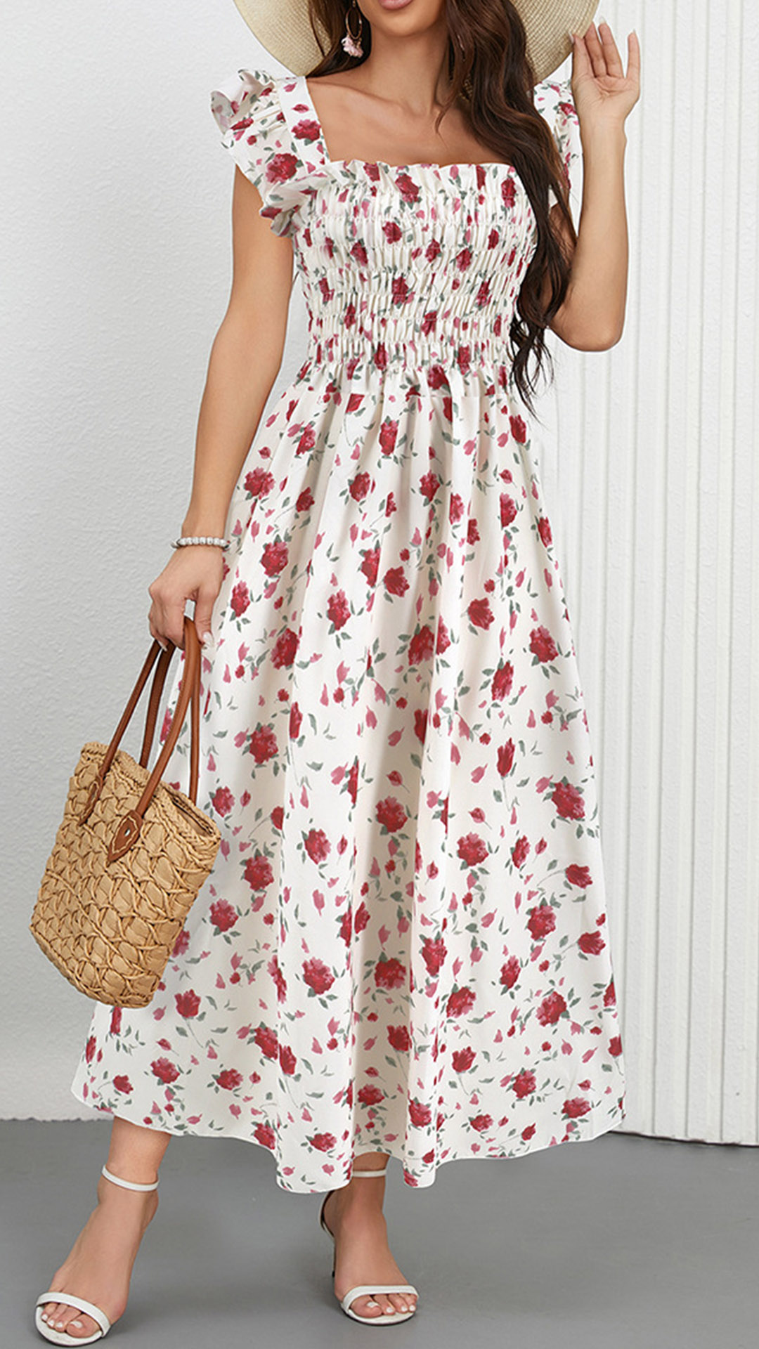 Fashion Floral Printed Square Neck Ruffle Sleeveless Smocked Bodice High-rise Midi Dress
