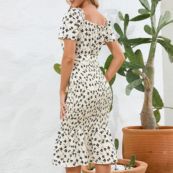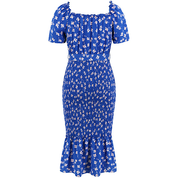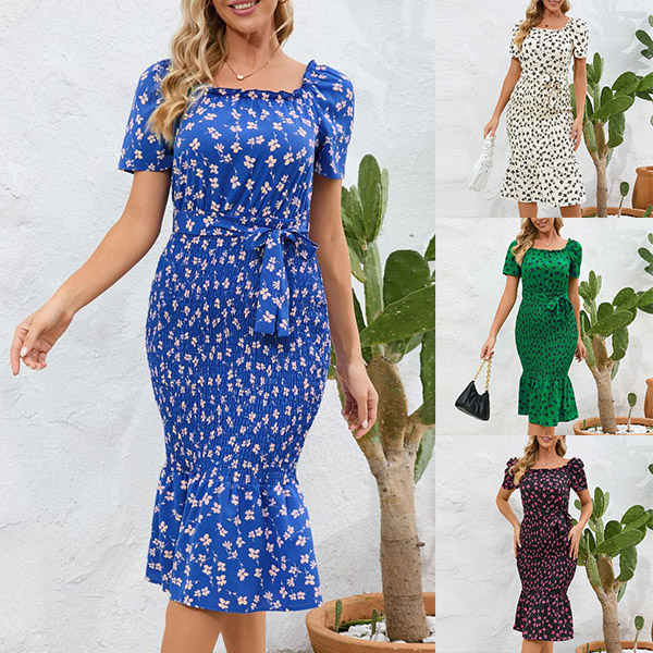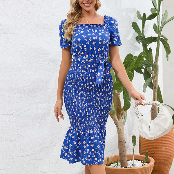Fashion Floral Printed Square-neck Short Sleeve Self-tie Fishtail Bodycon Dress