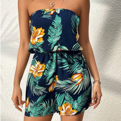 Fashion Floral Printed Strapless Elastic Waist Romper