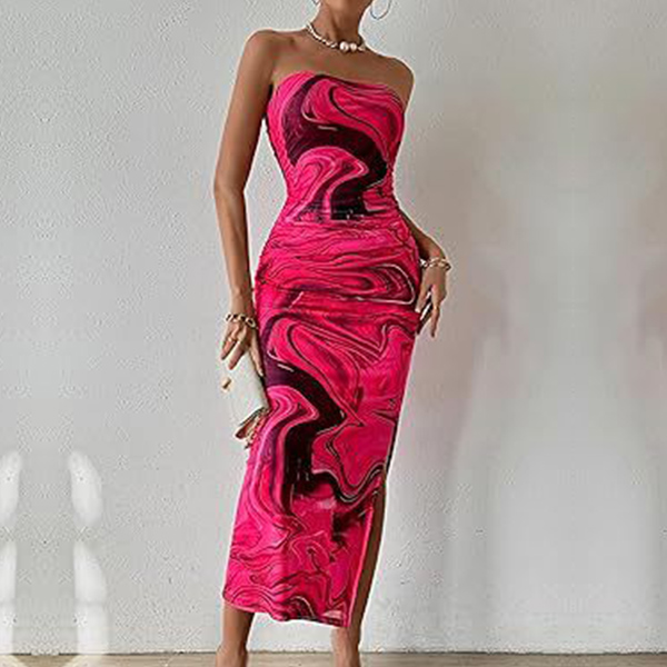 Make a statement in this Midi Bodycon Dress. This stunning dress features a vibrant floral print that adds a pop of color and femininity to your look. The strapless design is elegant and chic, perfect for showcasing your shoulders and collarbones. Whether you wear it with heels for a formal event or sandals for a summer party, this floral printed bodycon dress is sure to make you stand out from the crowd and turn heads wherever you go.
