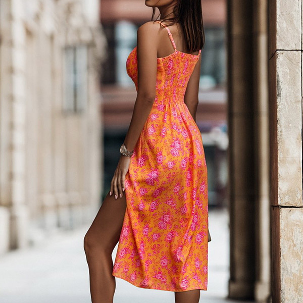 Fashion Floral Printed Sweetheart Neckline Slit Cami Dress