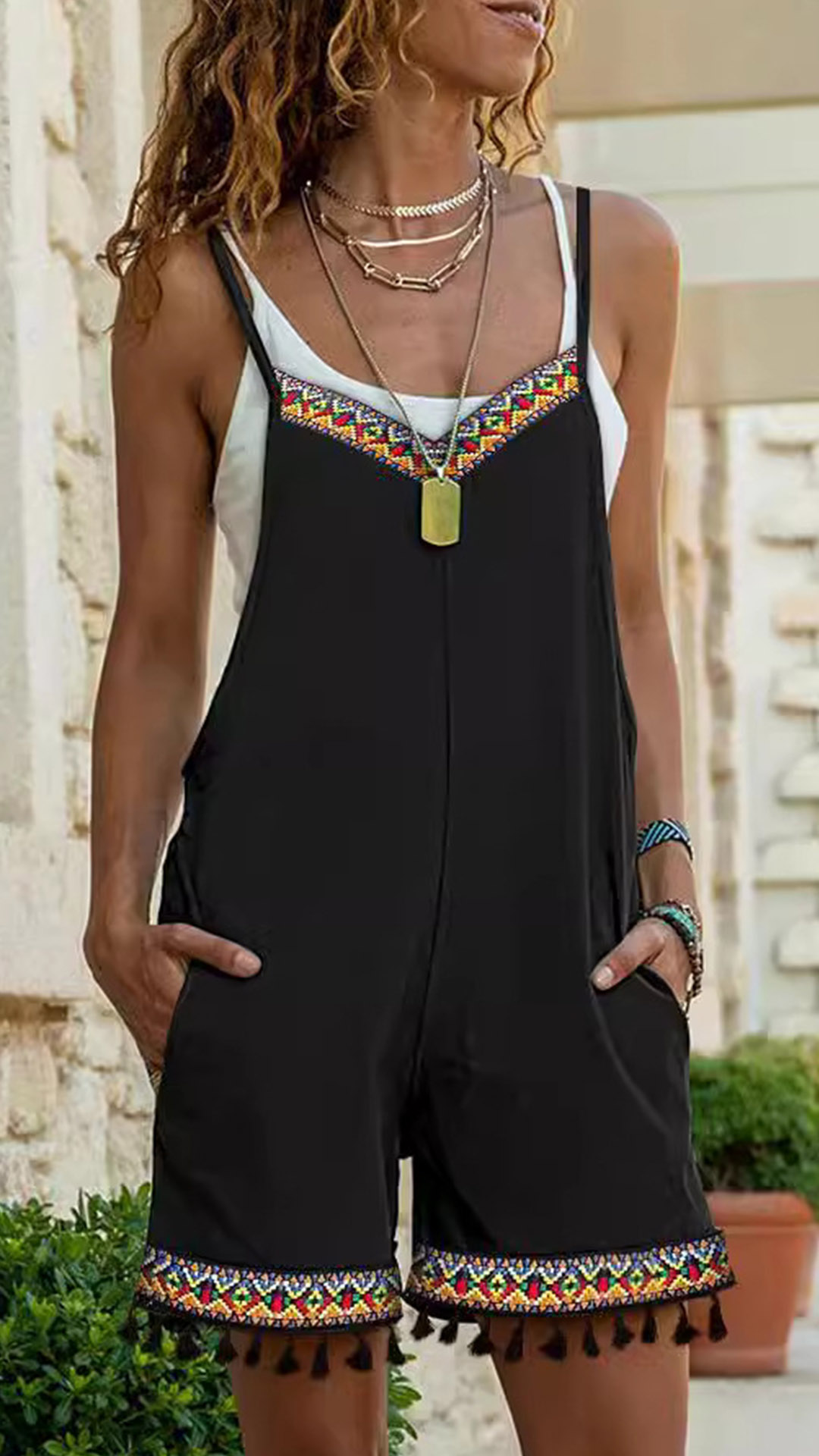 This eye-catching and stylish romper features a vibrant and whimsical floral print along the hemline that adds a touch of feminine flair to the overall look. While the tassle design adds a unique and bohemian-inspired element to the piece. Wanna have a try?