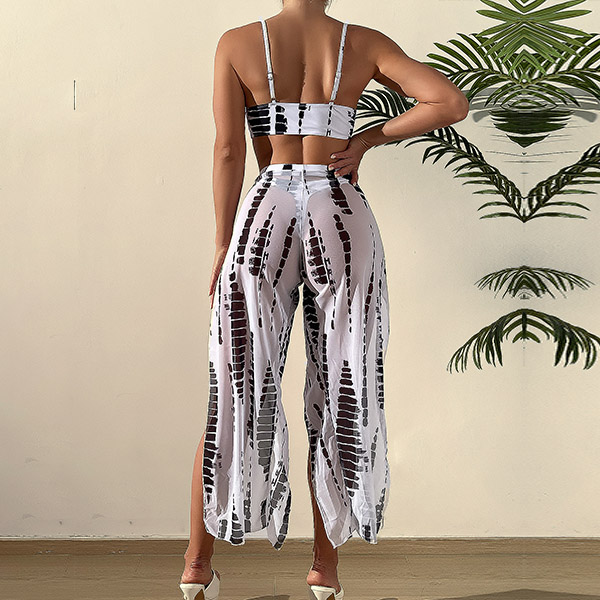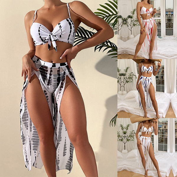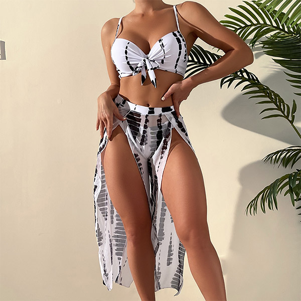 Fashion Floral Printed Three-piece Swimsuits Consist of Self-tie Swimming Bra, Low-rise Swimming Bottom and Slit Swimming Cover-up Skirt