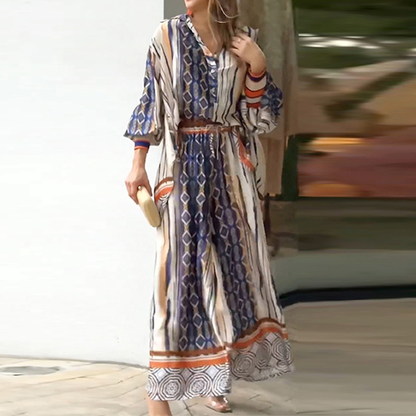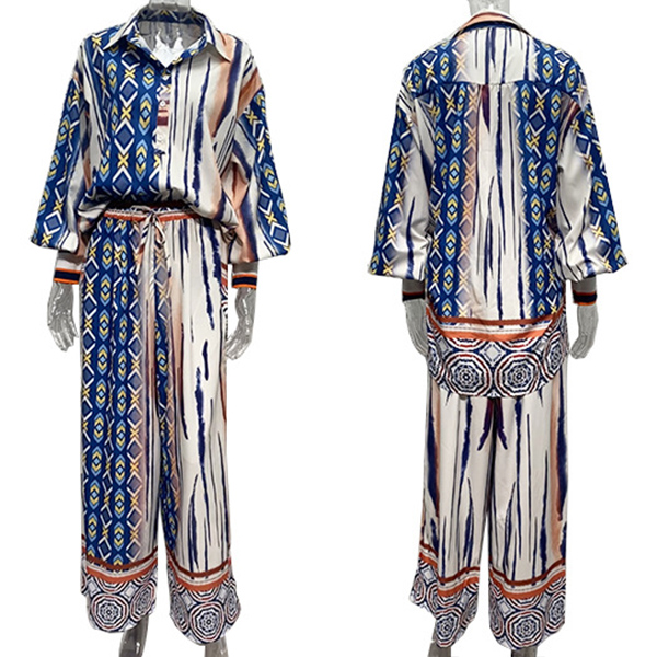 This fashionable two-piece set consists of a floral-printed blouse and matching pants, creating a coordinated and stylish ensemble.