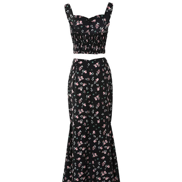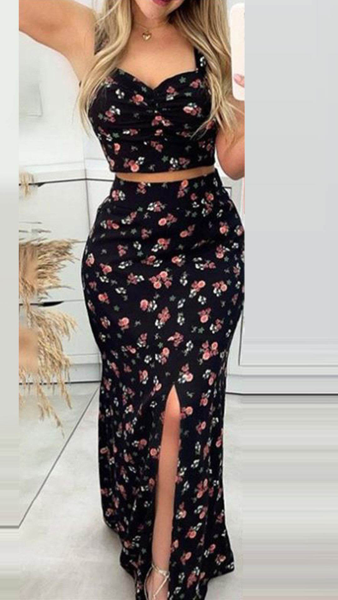 Fashion Floral Printed Two-piece Set Consist of Crop Top and Slit Maxi Skirt