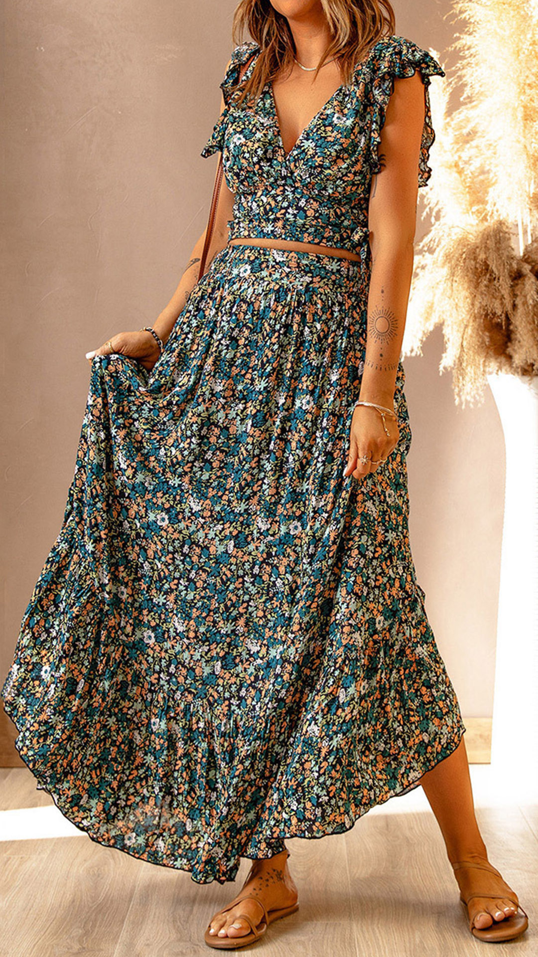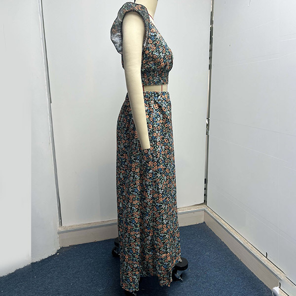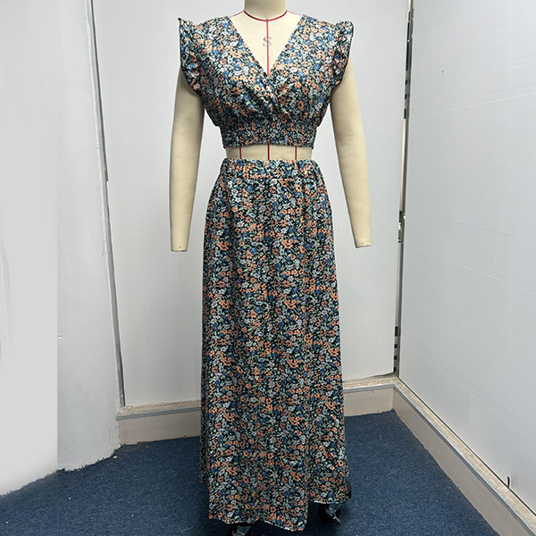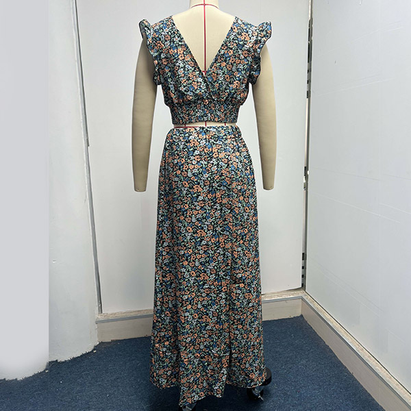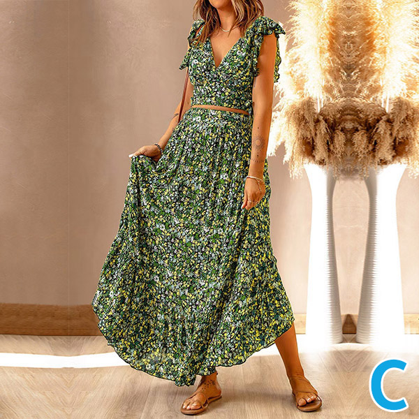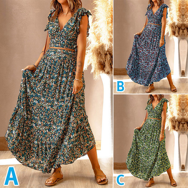This Two-piece set is perfect for any summer occasion! The set includes a V-neck crop top and a maxi skirt, both adorned with a beautiful floral print.