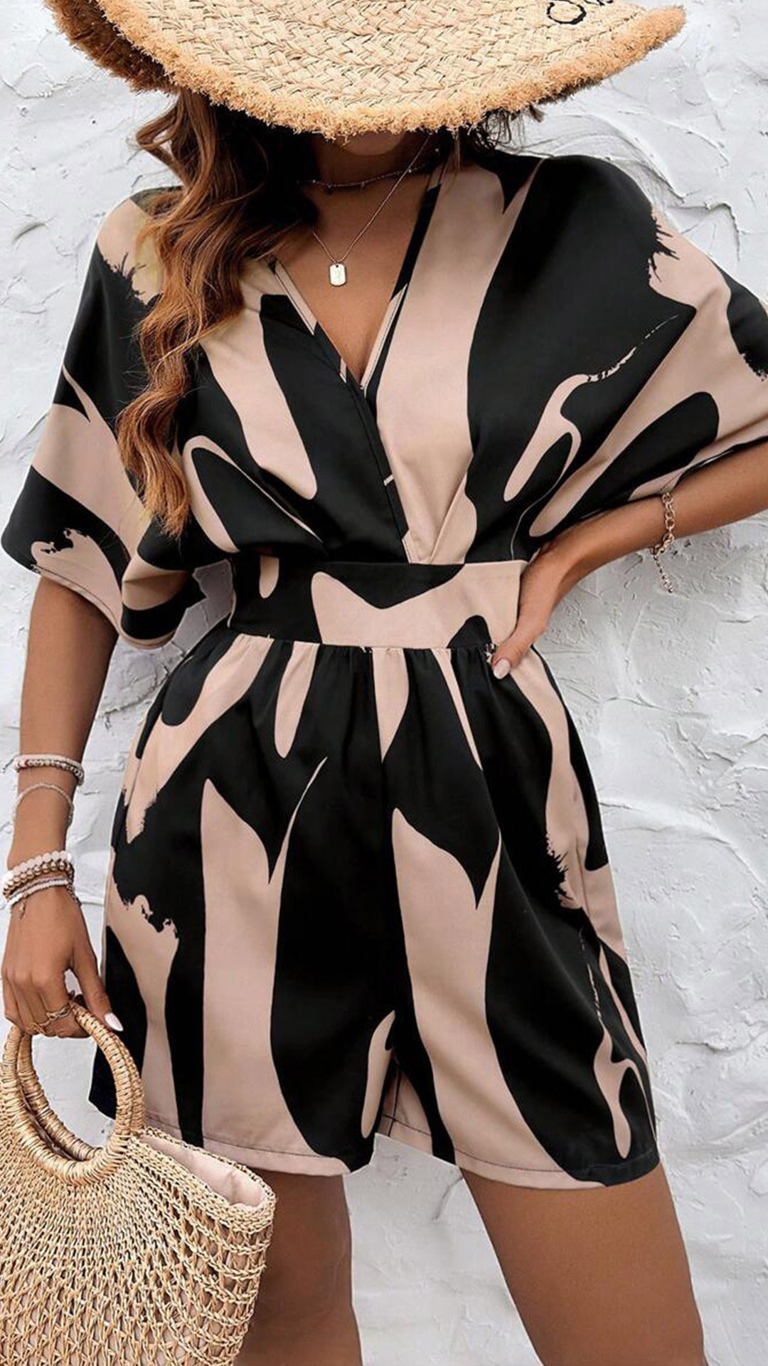 This romper features a floral print, a V-neckline, batwing sleeves for a trendy and chic look.