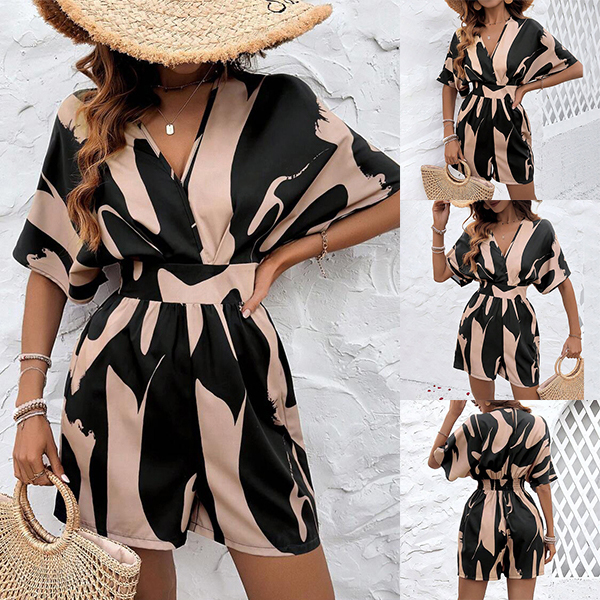 Fashion Floral Printed V-neck Batwing Sleeve Romper