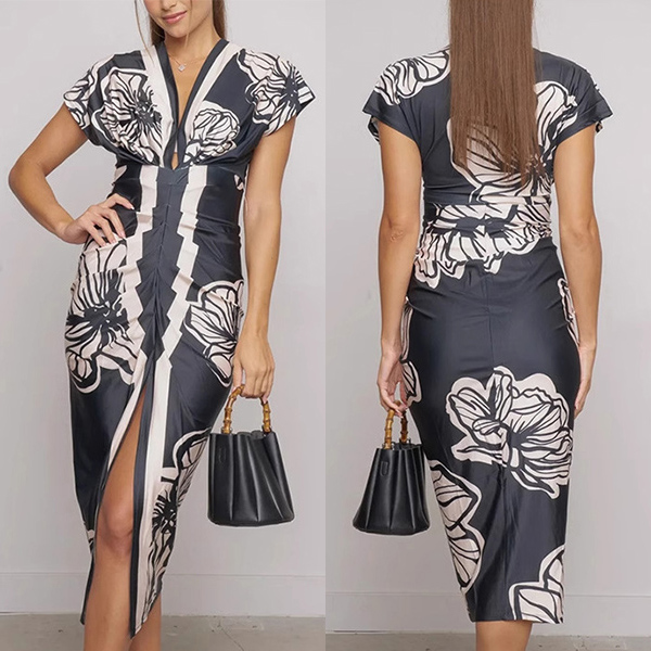 Fashion Floral Printed V-neck Cap Sleeve Front Slit Bodycon Dress