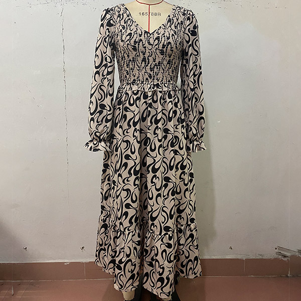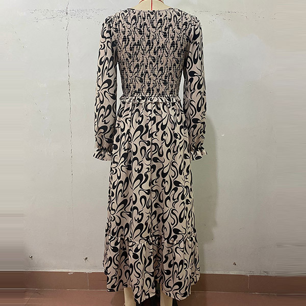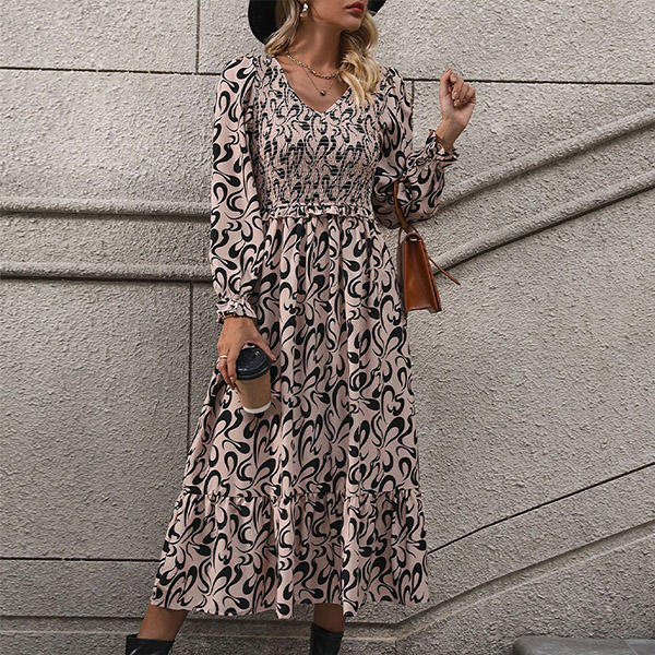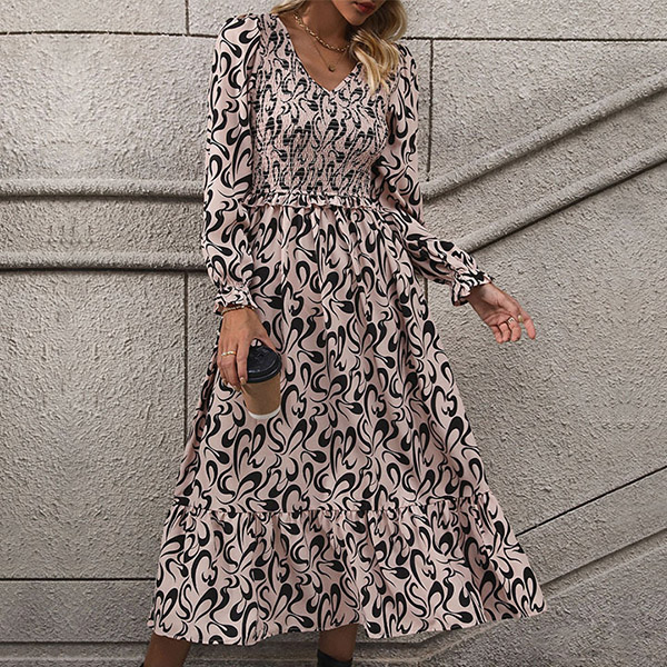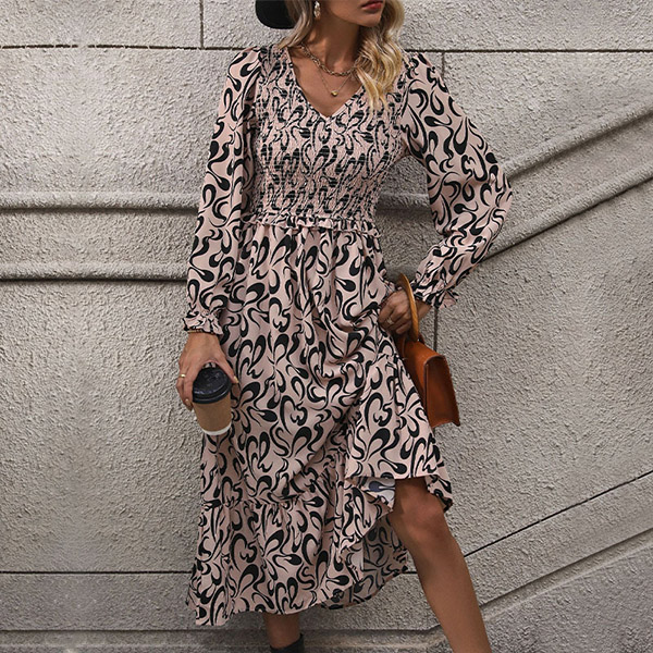 Fashion Floral Printed V-neck Long Sleeve High-rise Dress