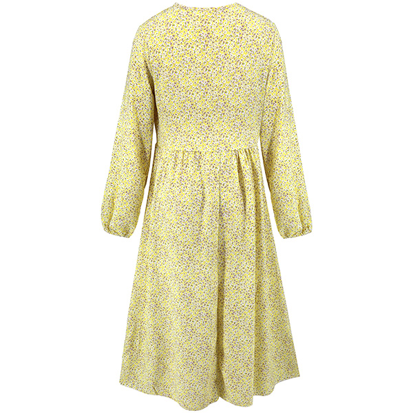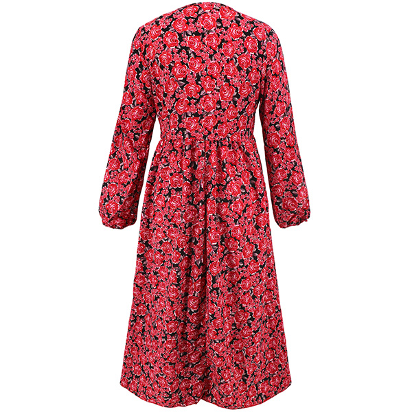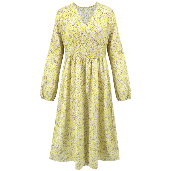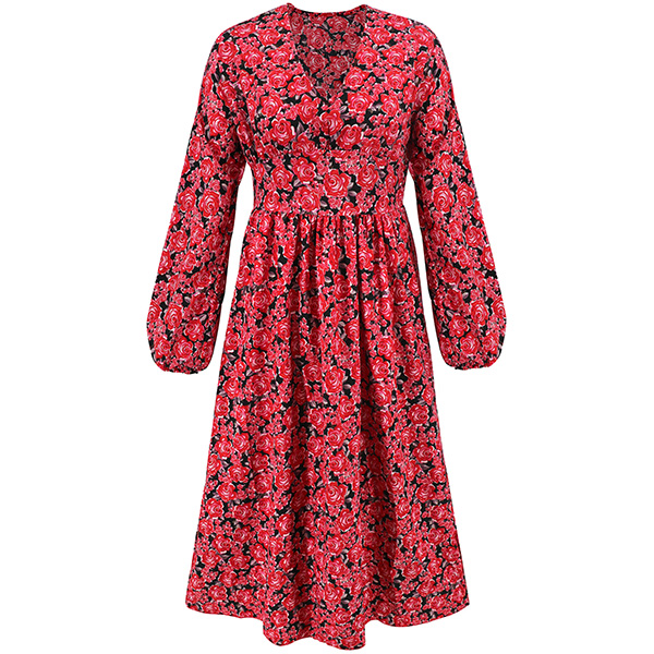 With its V-neckline, long sleeves, high-rise waistline, and floral print, this dress is the perfect choice for adding a touch of romance and elegance to your outfit.