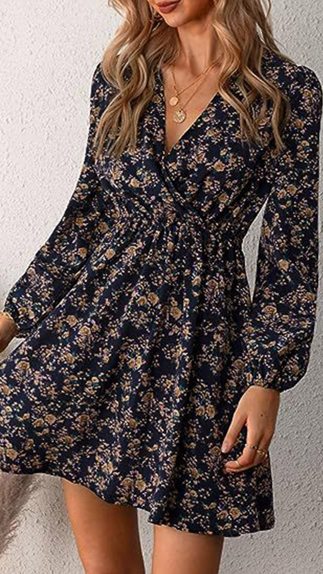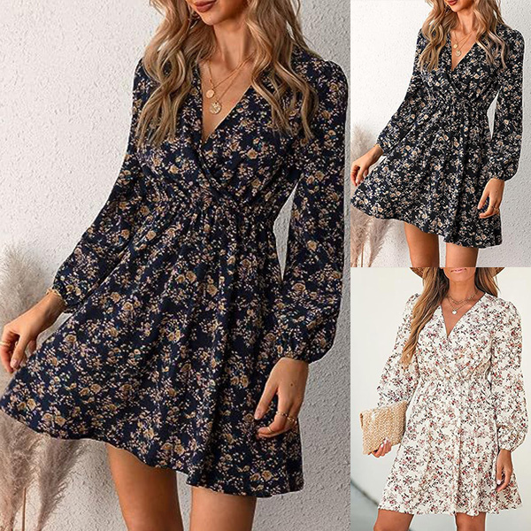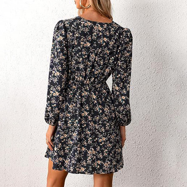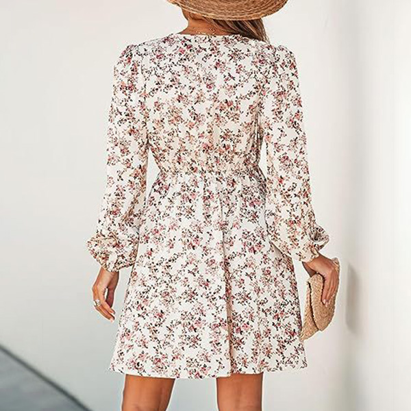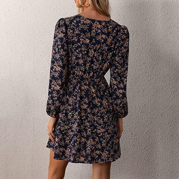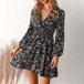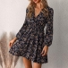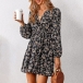 Fashion Floral Printed V-neck Long Sleeve Mini Dress