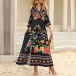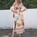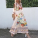Fashion Floral Printed V-neck Open Shoulder Elbow Sleeve Slit Midi Dress