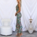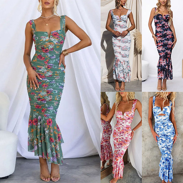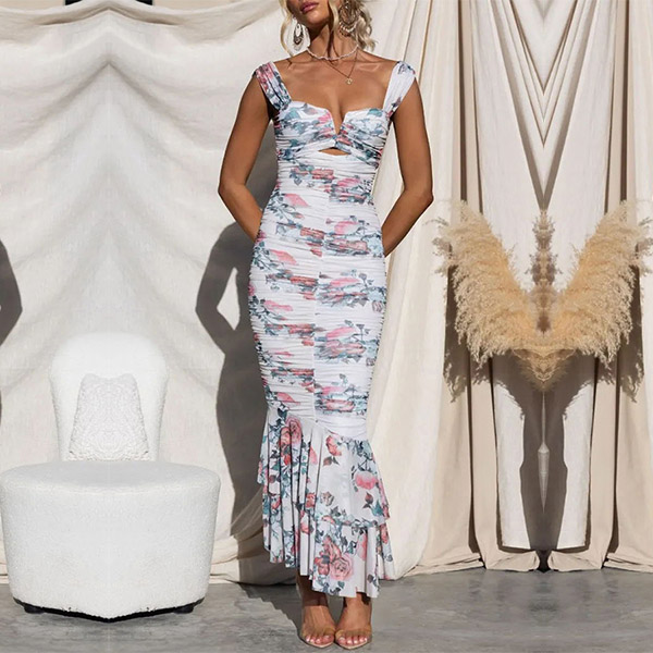Fashion Floral Printed V-neck Ruched Fishtail Bodycon Dress