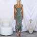 This midi dress features a floral print, a V-neckline, ruched detailing, and a fishtail hem for a glamorous and figure-flattering look.