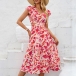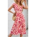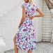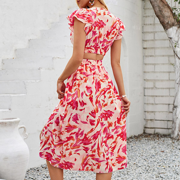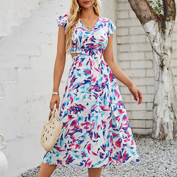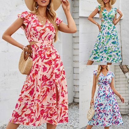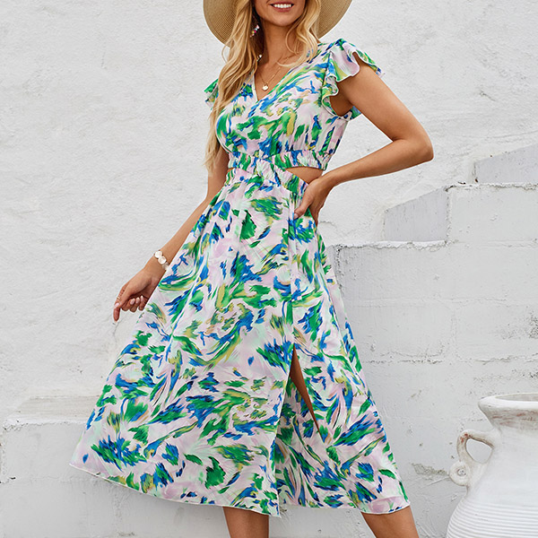 Fashion Floral Printed V-neck Ruffled Cap Sleeve Side Cutout Dress