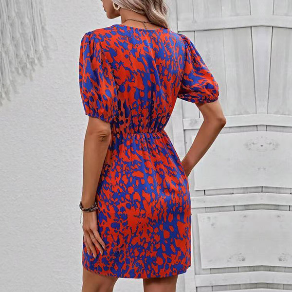 Fashion Floral Printed V-neck Short Sleeve Irregular Hemline Dress
