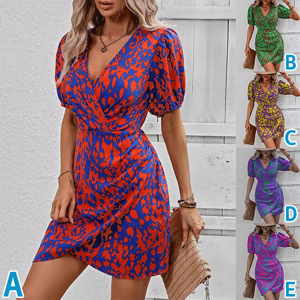 This fashionable dress features a flattering V-neckline, short sleeves, and an eye-catching floral print, all complemented by an irregular hemline, creating a stylish and unique ensemble.
